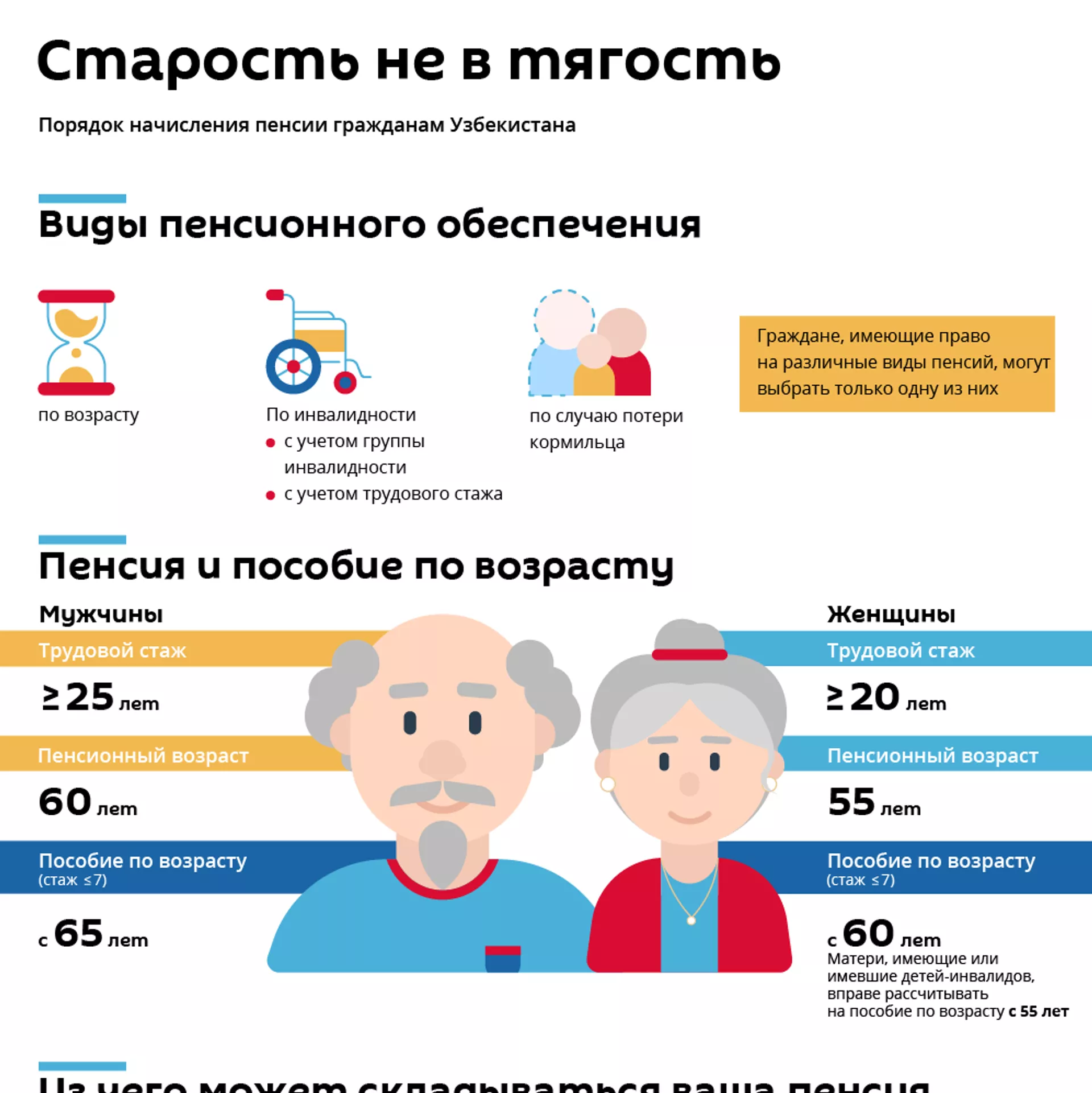 В Узбекистане действуют три вида пенсионного обеспечения: по возрасту, инвалидности и по случаю потери кормильца. Граждане, имеющие право на разные виды пенсий, могут выбрать только одну из них.