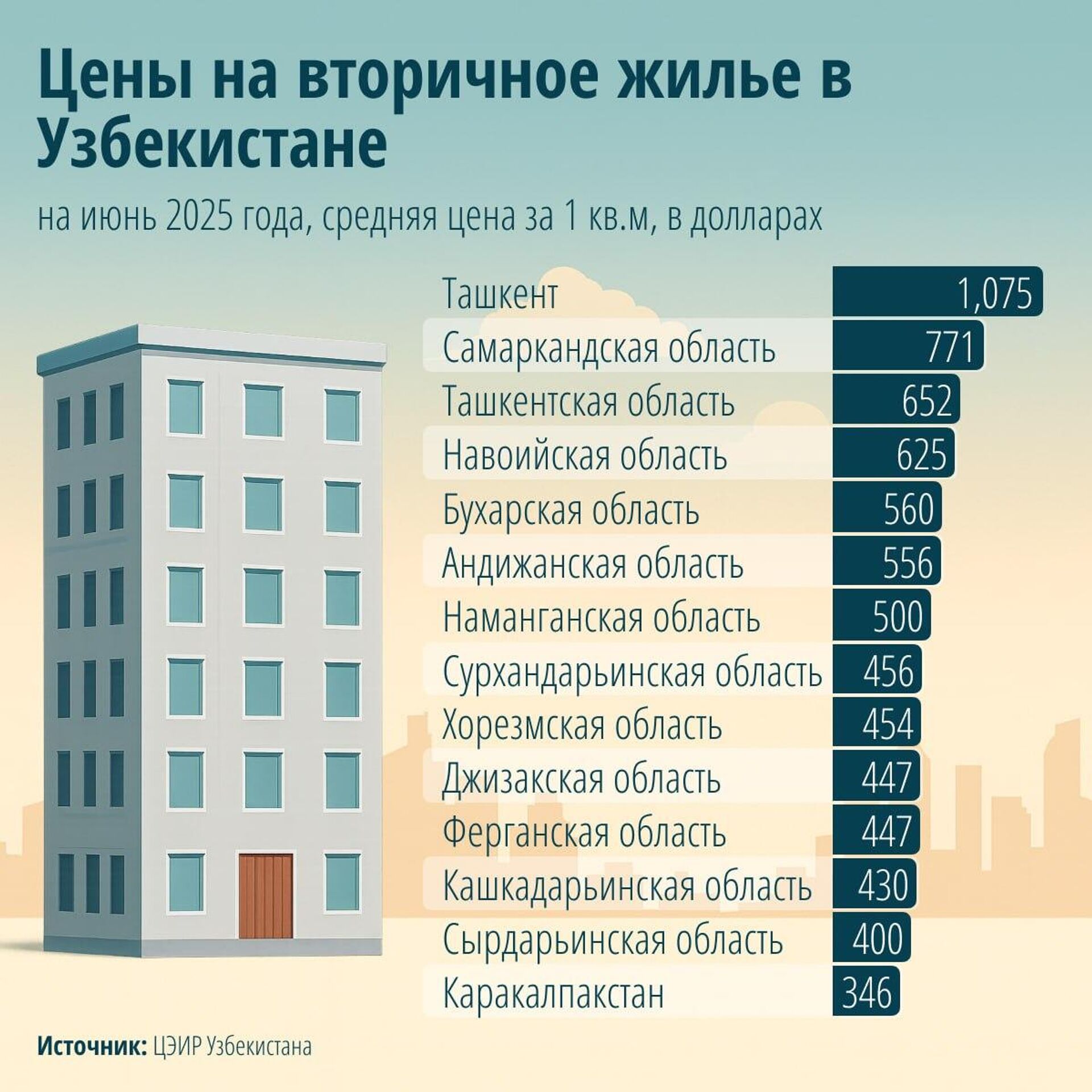 Самая дешёвая "вторичка" - в Каракалпакстане, где 1 кв. м в среднем стоит $346.