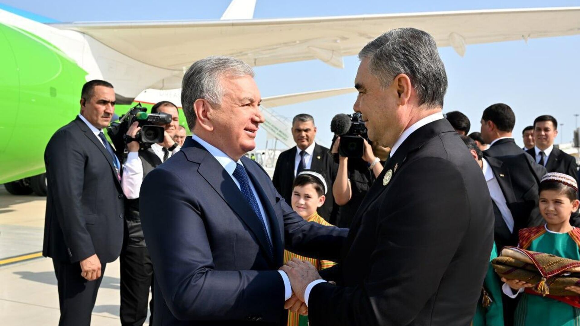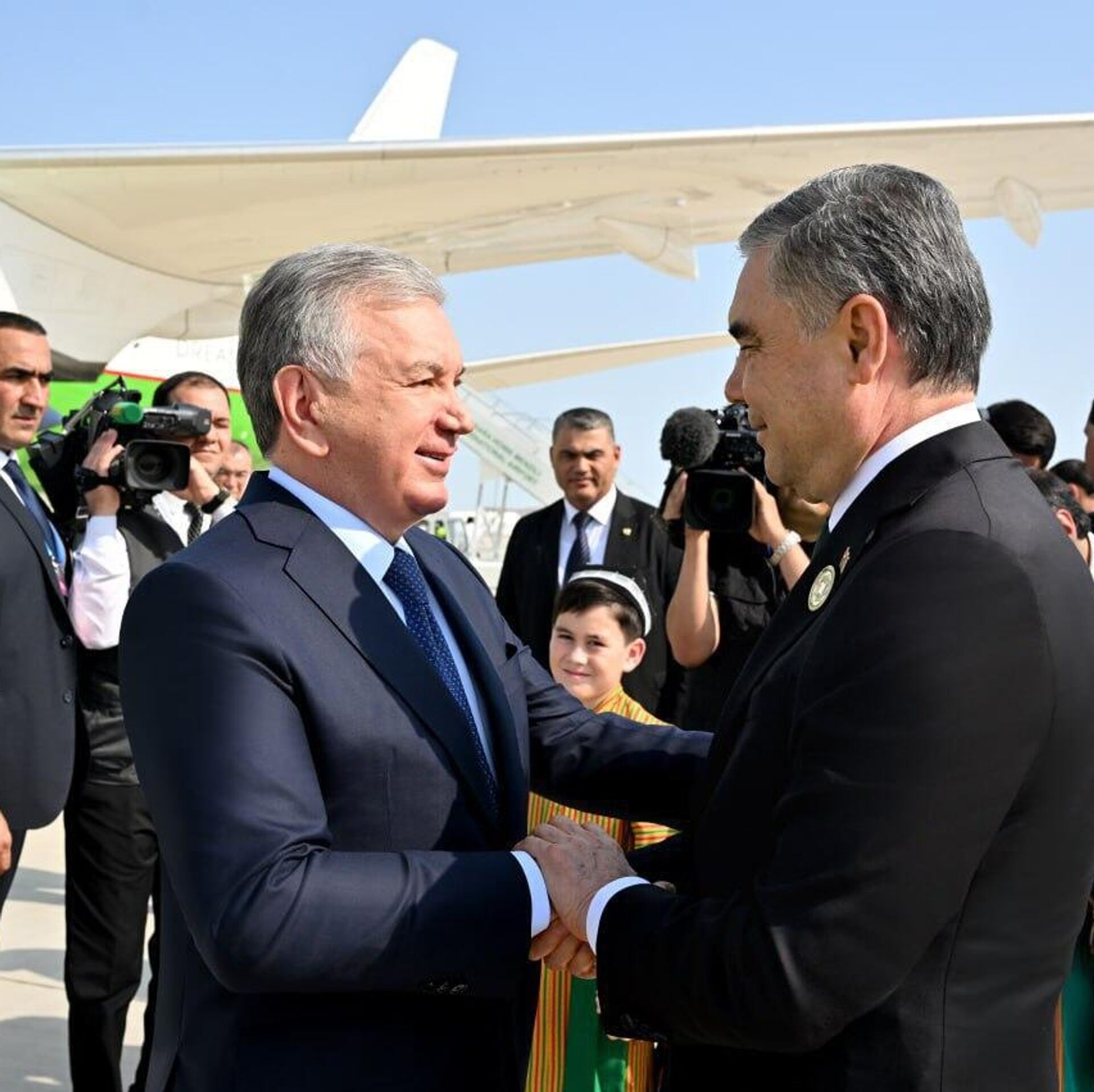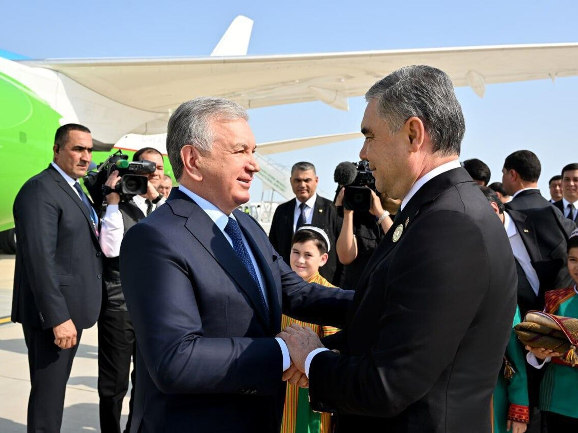 В аэропорту города Туркменбаши лидера Узбекистана встретил Национальный лидер туркменского народа, Председатель Халк Маслахаты Гурбангулы Бердымухамедов.