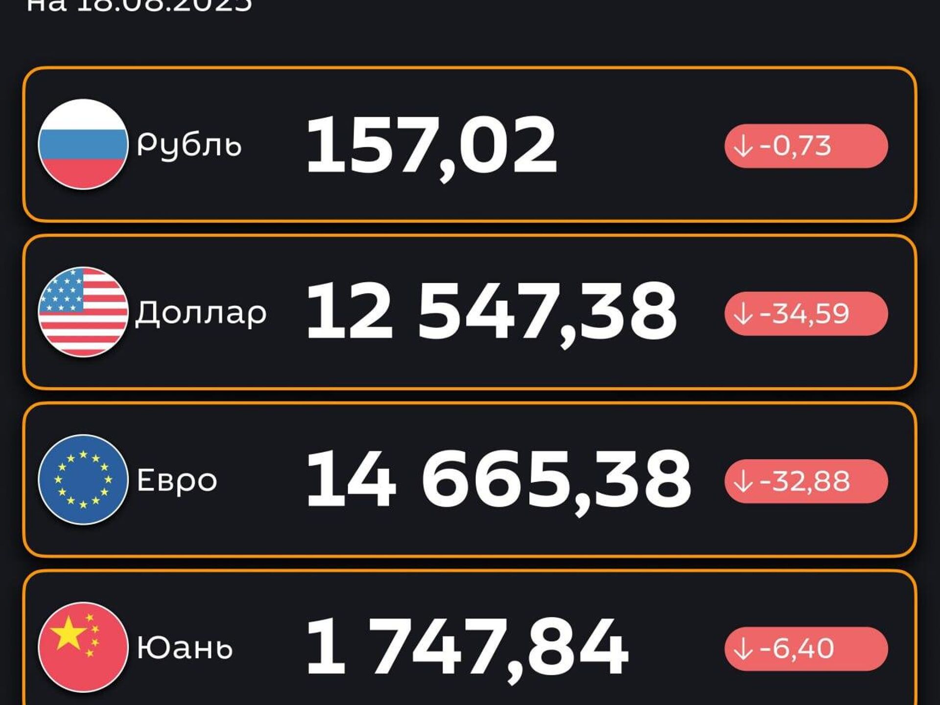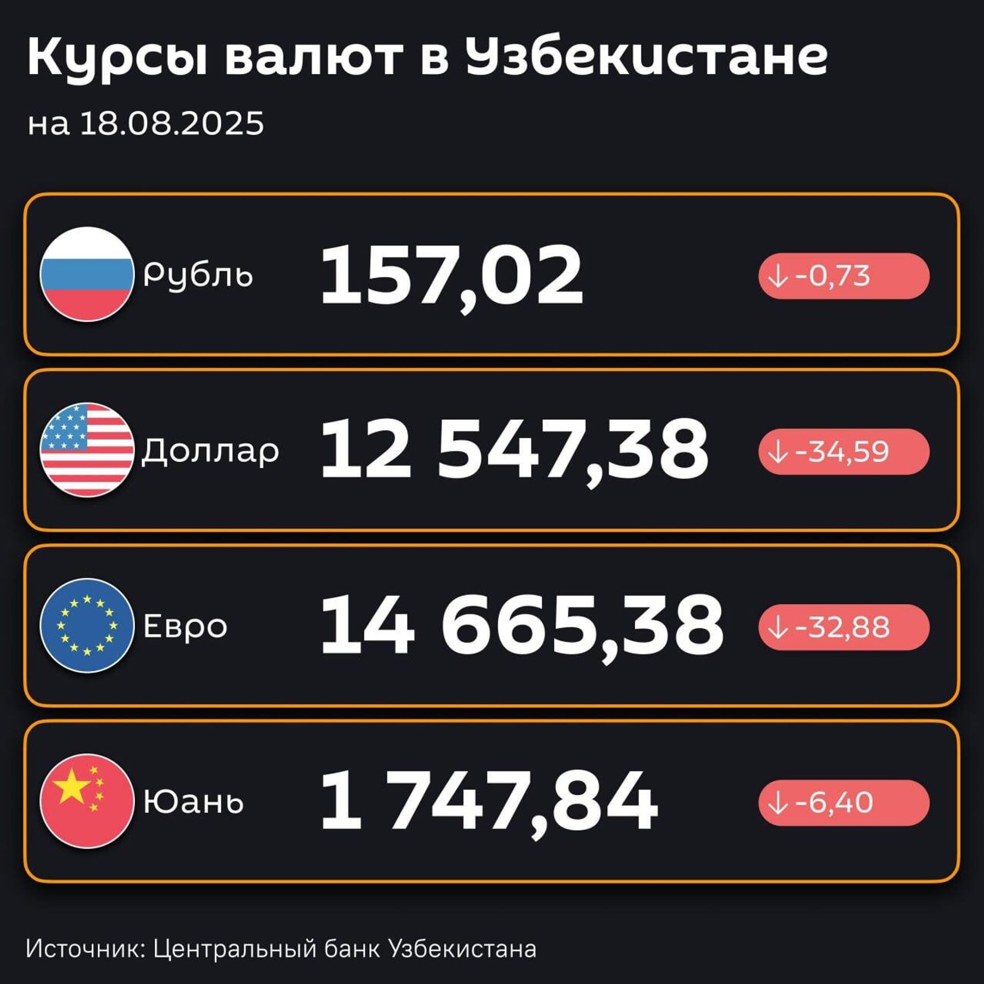 Подешевели — ЦБ РУз установил новые курсы валют по отношению к суму с 18 августа. @SputnikUzbekistan