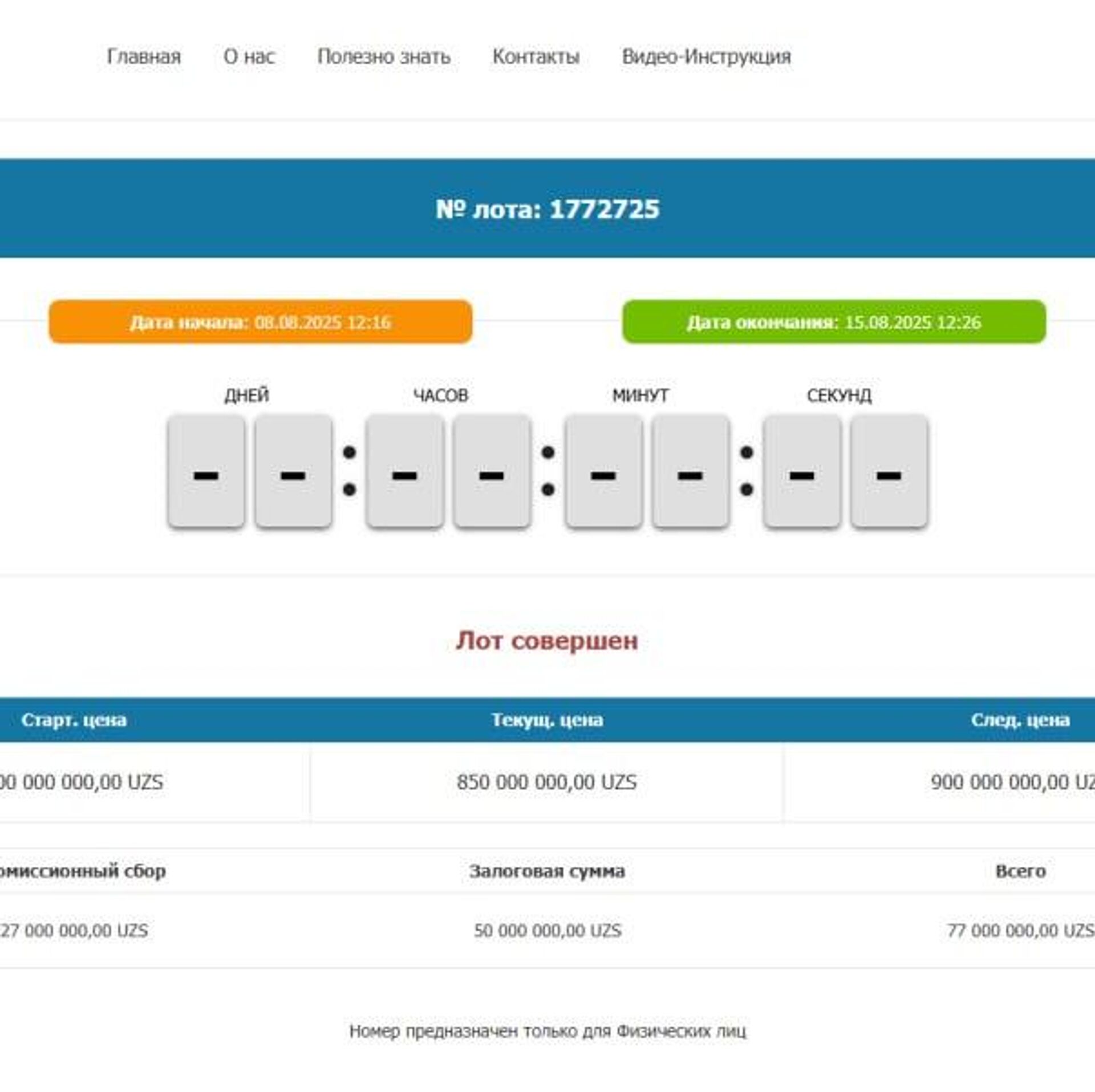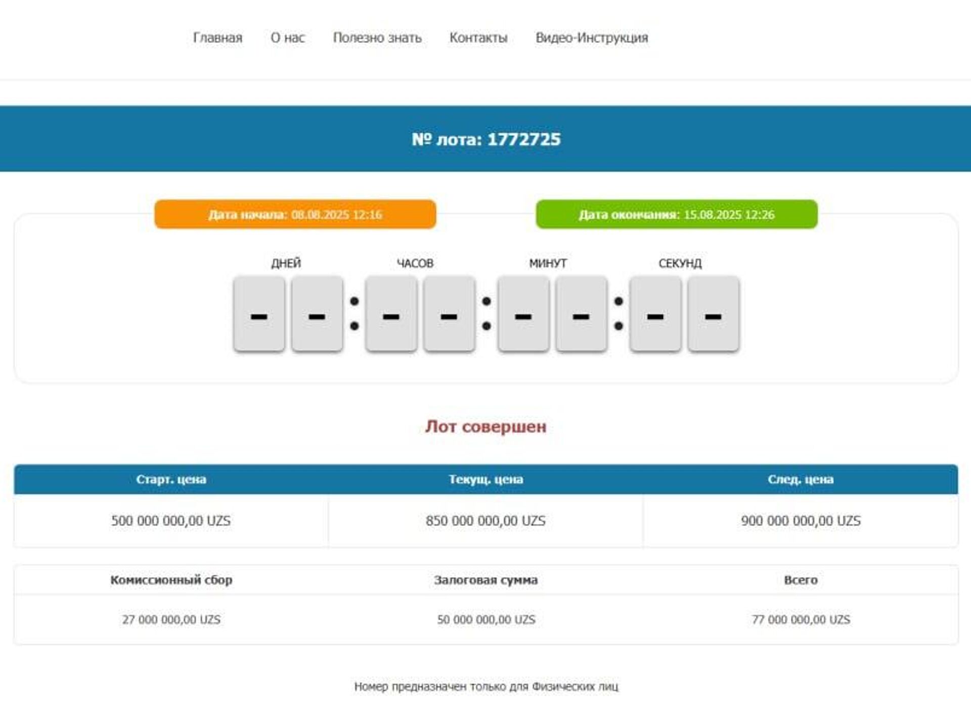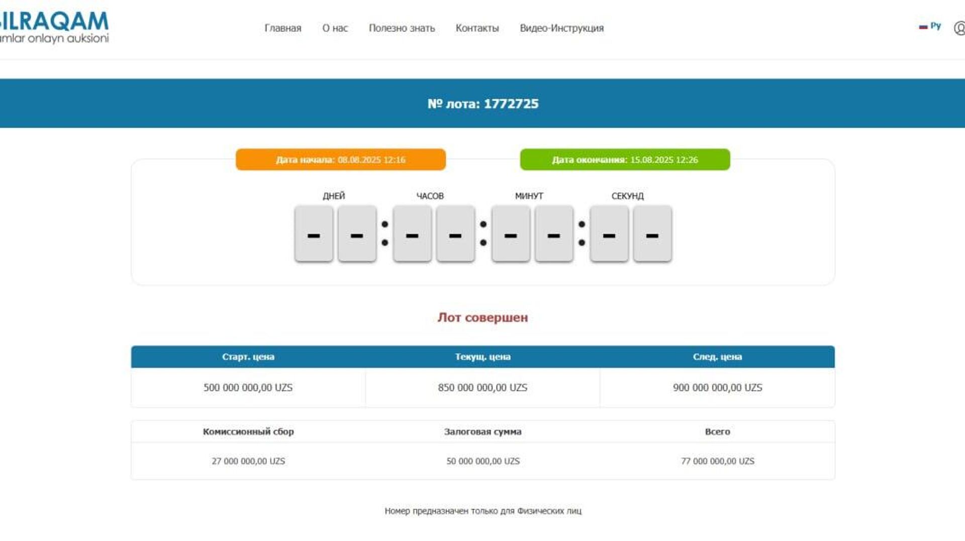 Аукцион состоялся 15 августа. Цена выросла с 500 млн до 850 млн сумов. Победителю предстоит внести 50 млн сумов залога и оплатить 27 млн сумов комиссии.