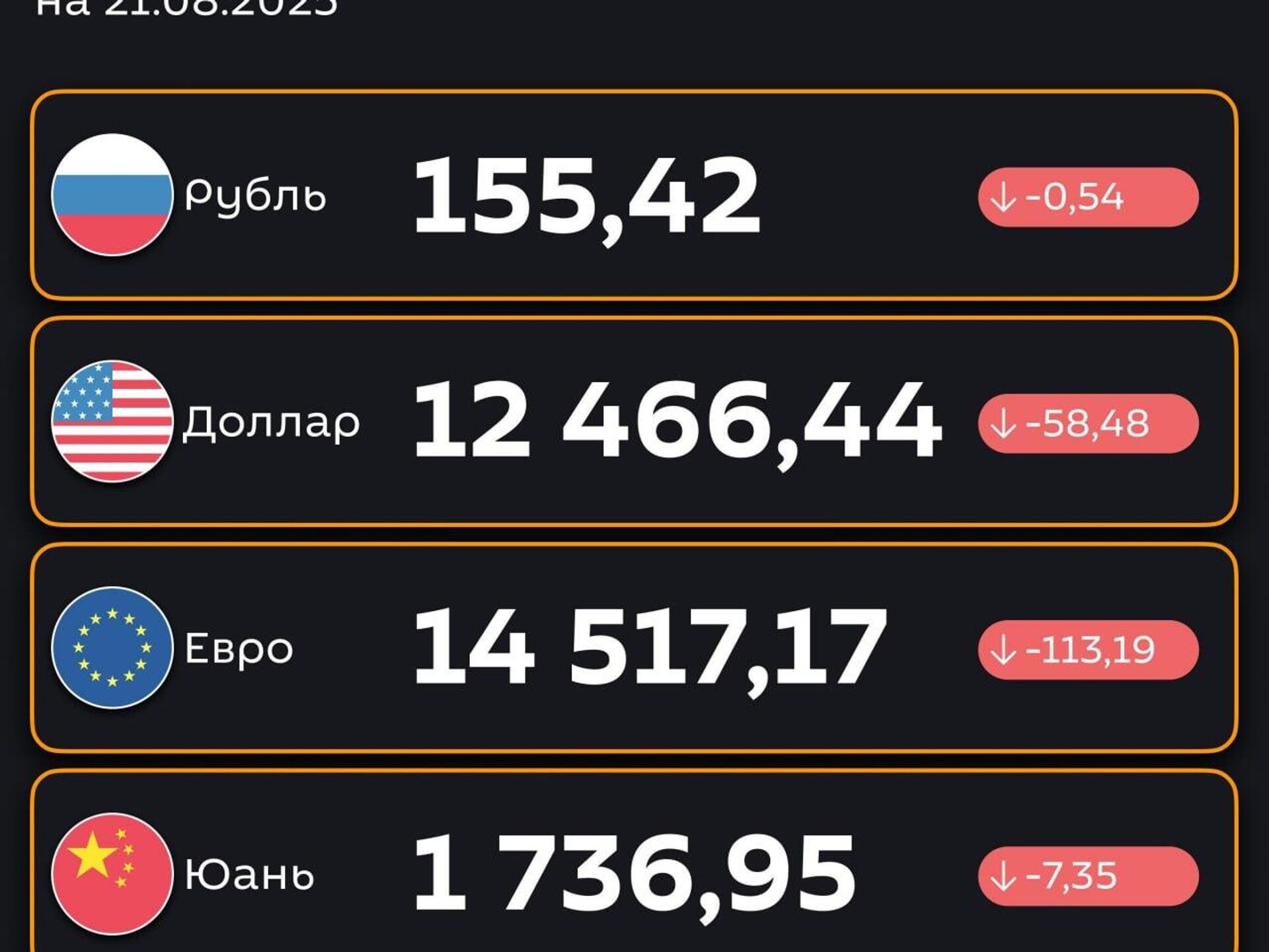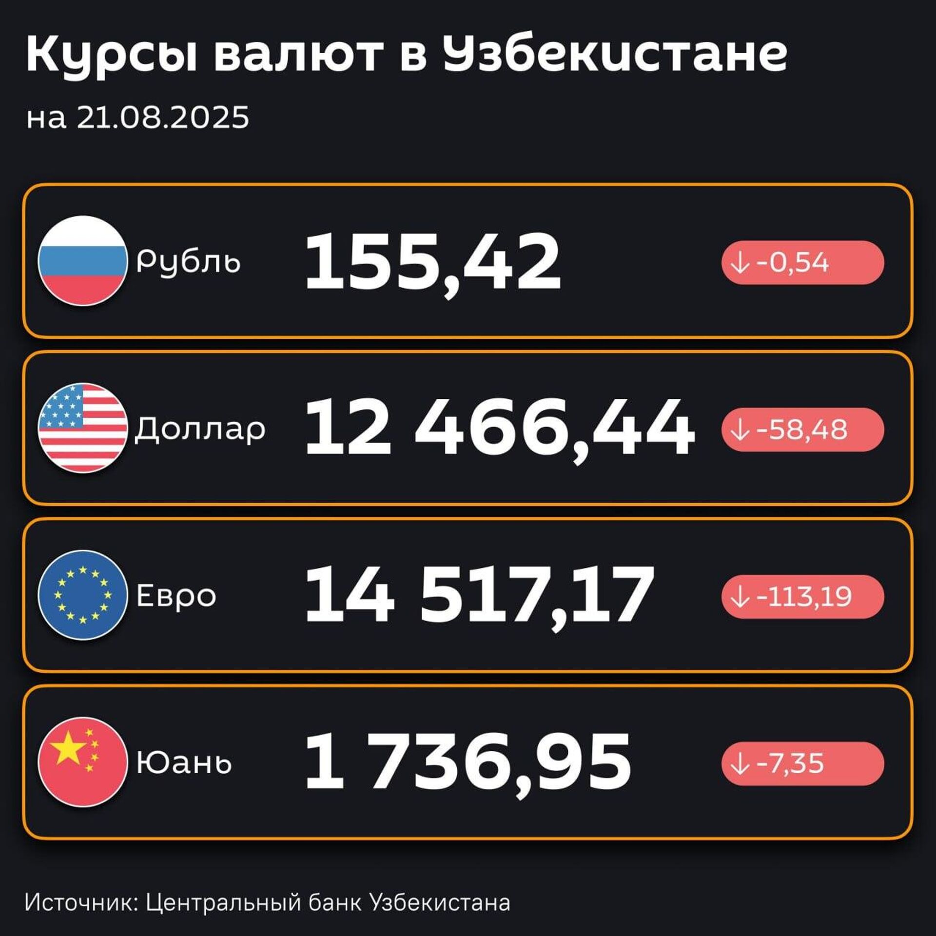 Подешевели — ЦБ РУз установил новые курсы валют по отношению к суму с 21 августа. @SputnikUzbekistan