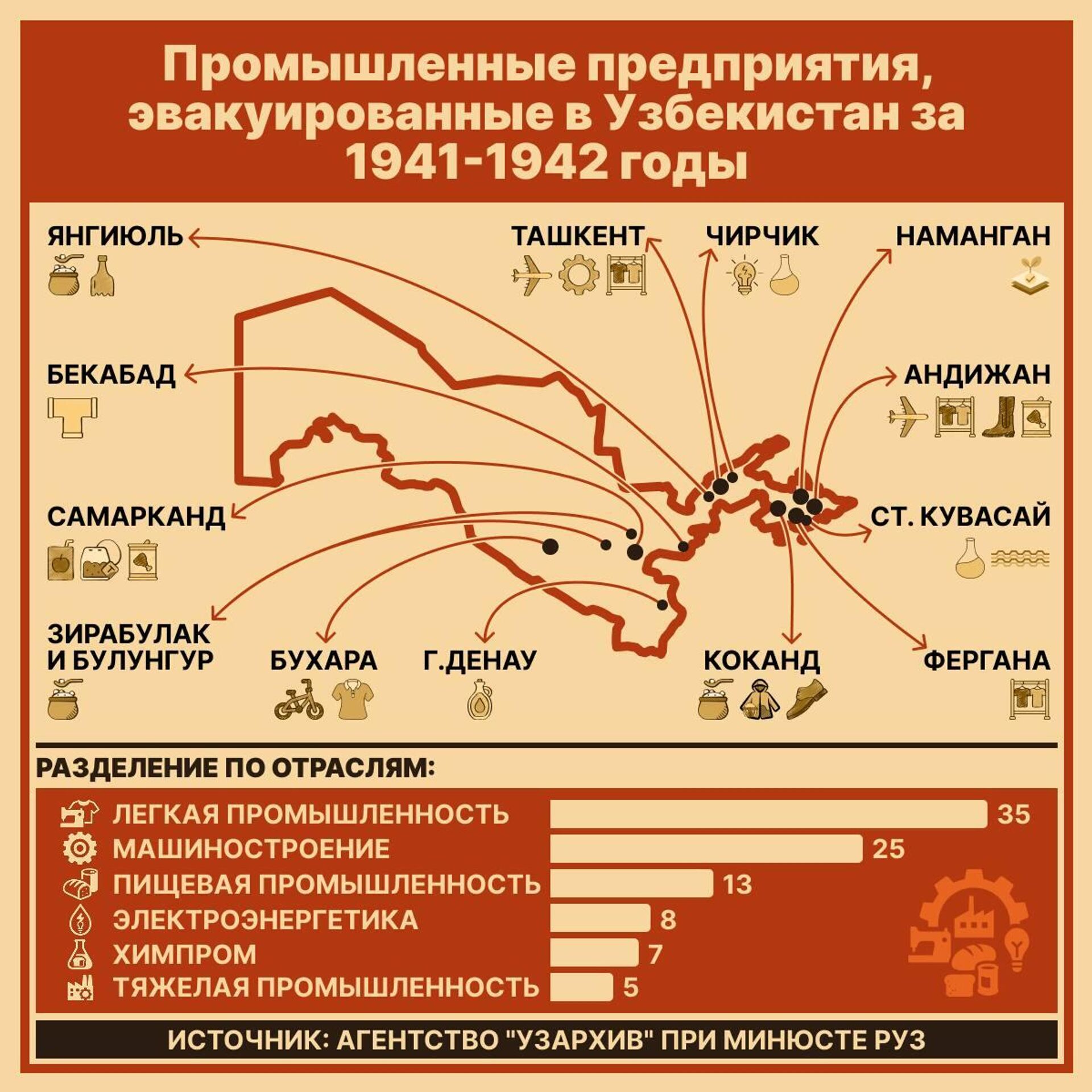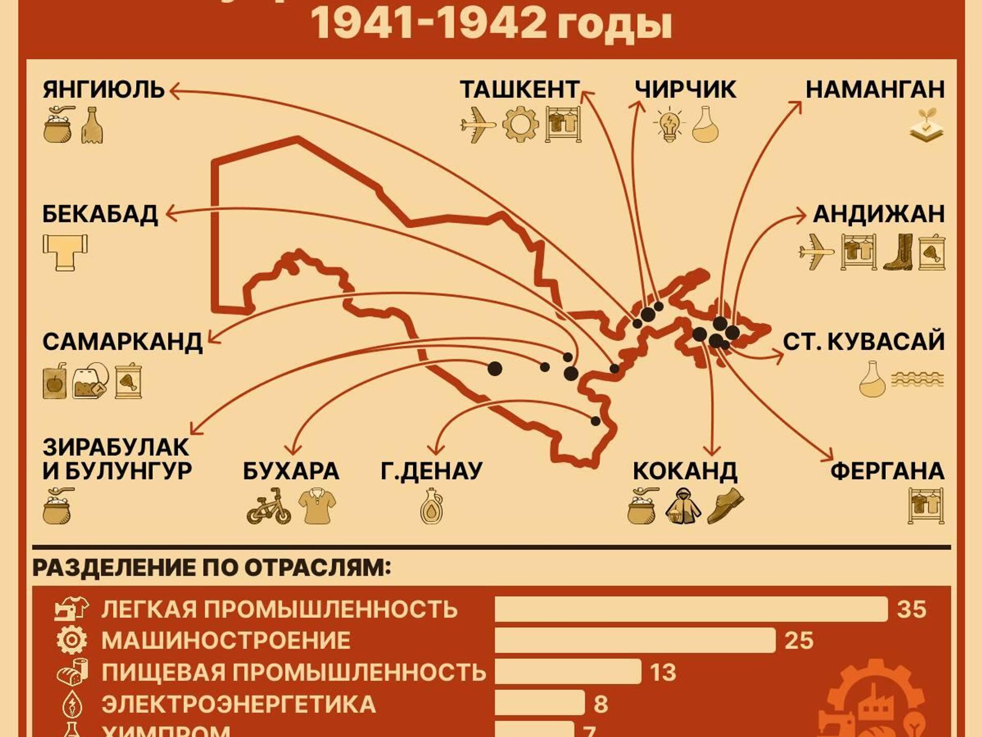 Только за первые два года (1941-1942) в республику эвакуировали 93 промышленных предприятия таких отраслей, как машиностроение, электроэнергетика, химпром, тяжелая, легкая и пищевая промышленность. Большинство из них разместили в Ташкенте и Ташобласти, а также в Фергане, Андижане, Намангане, Самарканде, Бухаре и Сурхандарье.