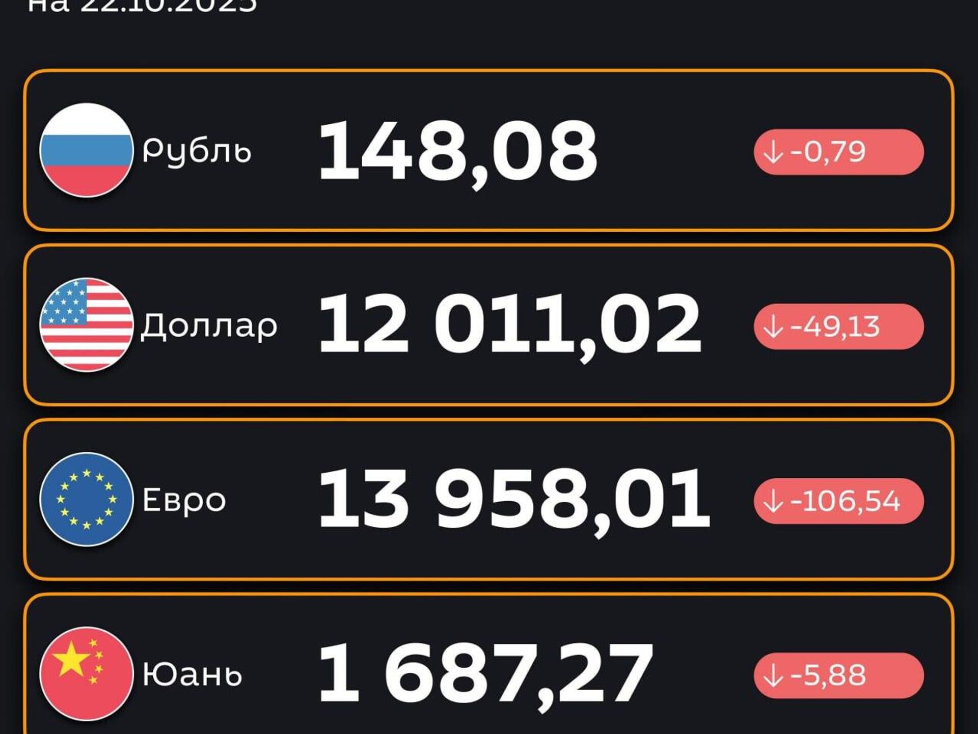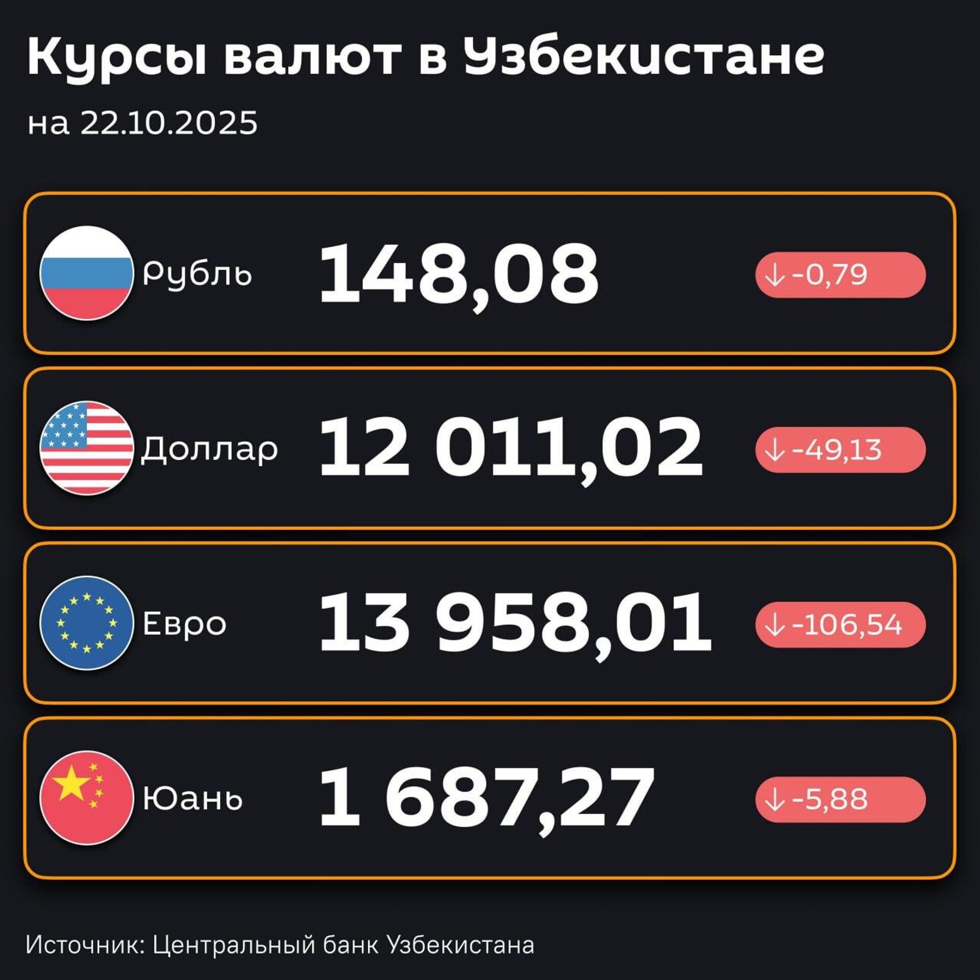 16:01 21.10.2025 (обновлено: 16:02 21.10.2025) Подешевели - ЦБ РУз установил новые курсы валют по отношению к суму с 22 октября