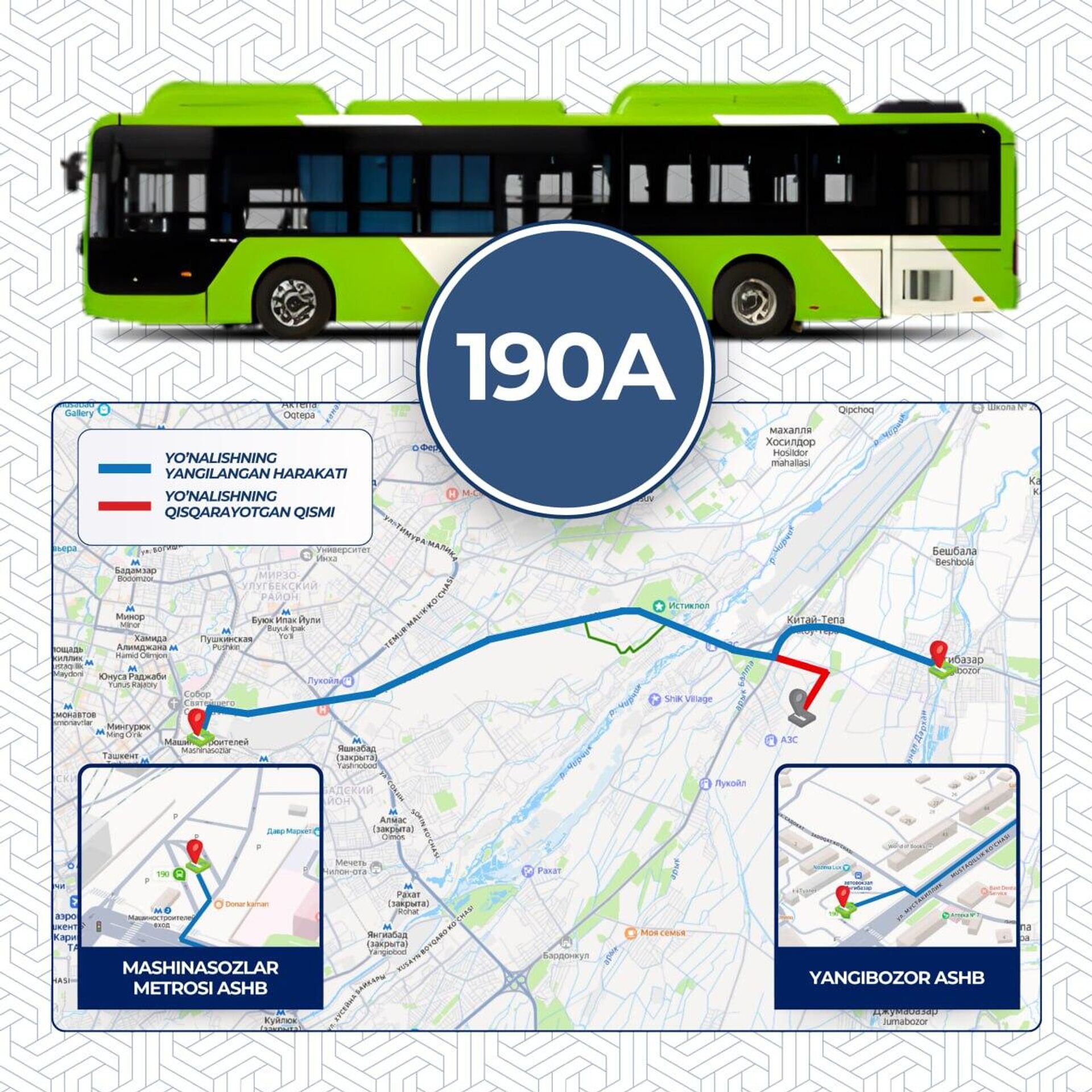 Напомним, автобус идет от остановки “Янгибазар” до станции метро "Машинасозлар”.