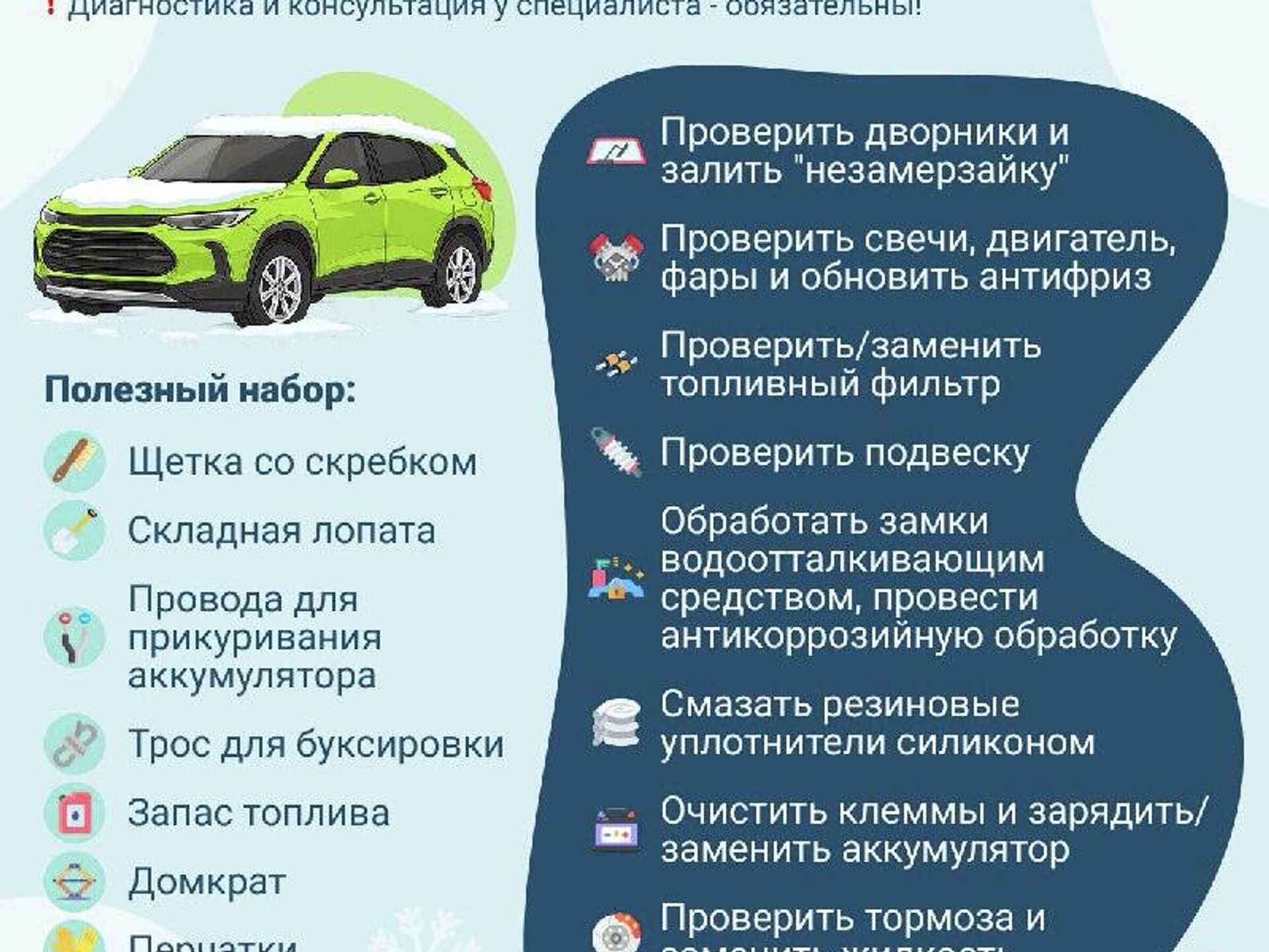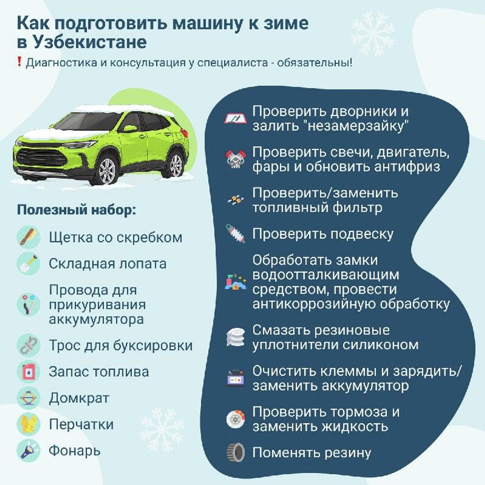 Чек-лист проверки готовности автомобиля к зимнему сезону - в инфографике @SputnikUzbekistan.