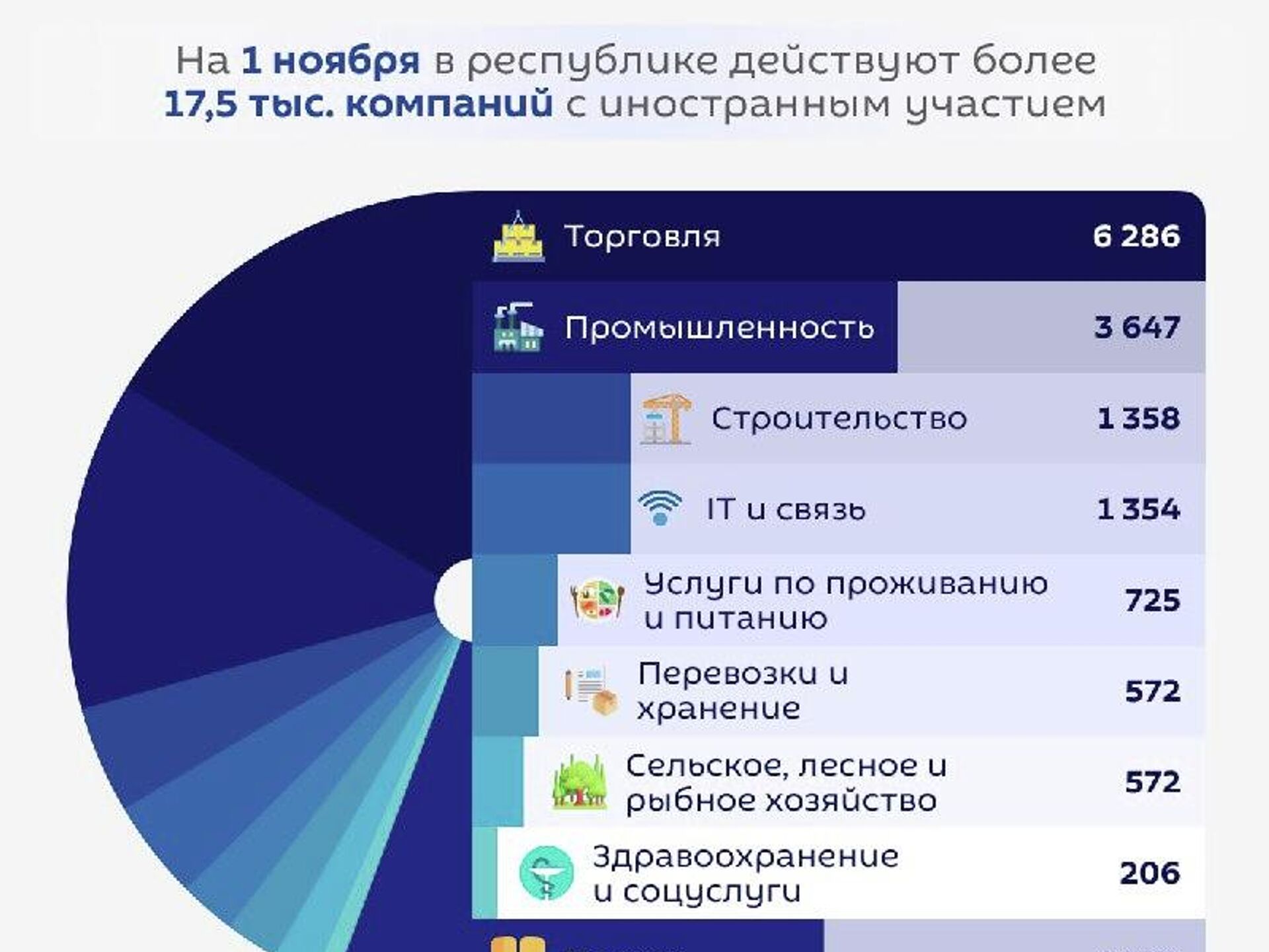 По данным Нацкомстата, на 1 ноября в стране работают свыше 17,5 тысячи компаний с иностранным участием. Наибольший интерес зарубежный бизнес проявляет к торговле, промышленности и строительству.