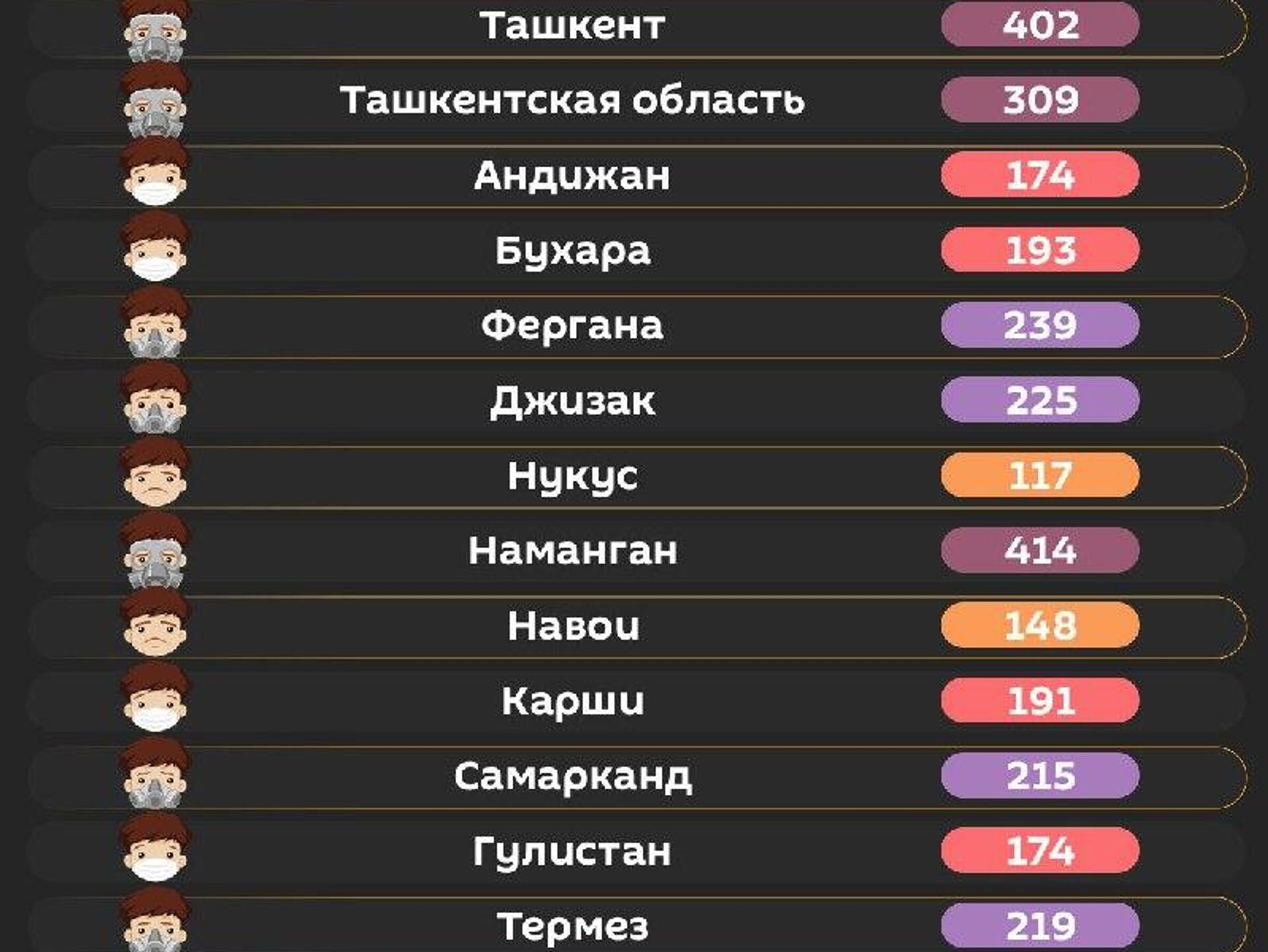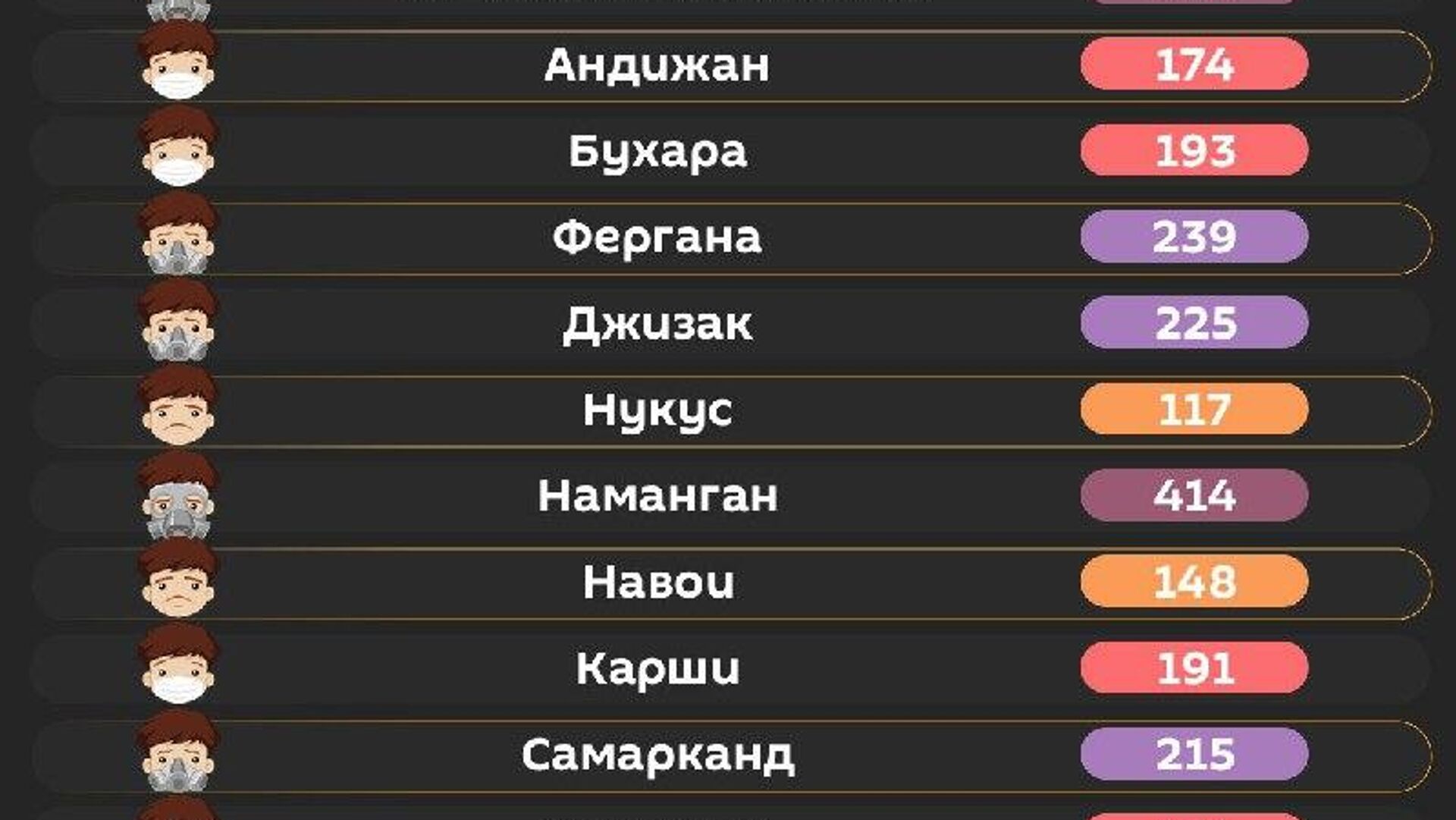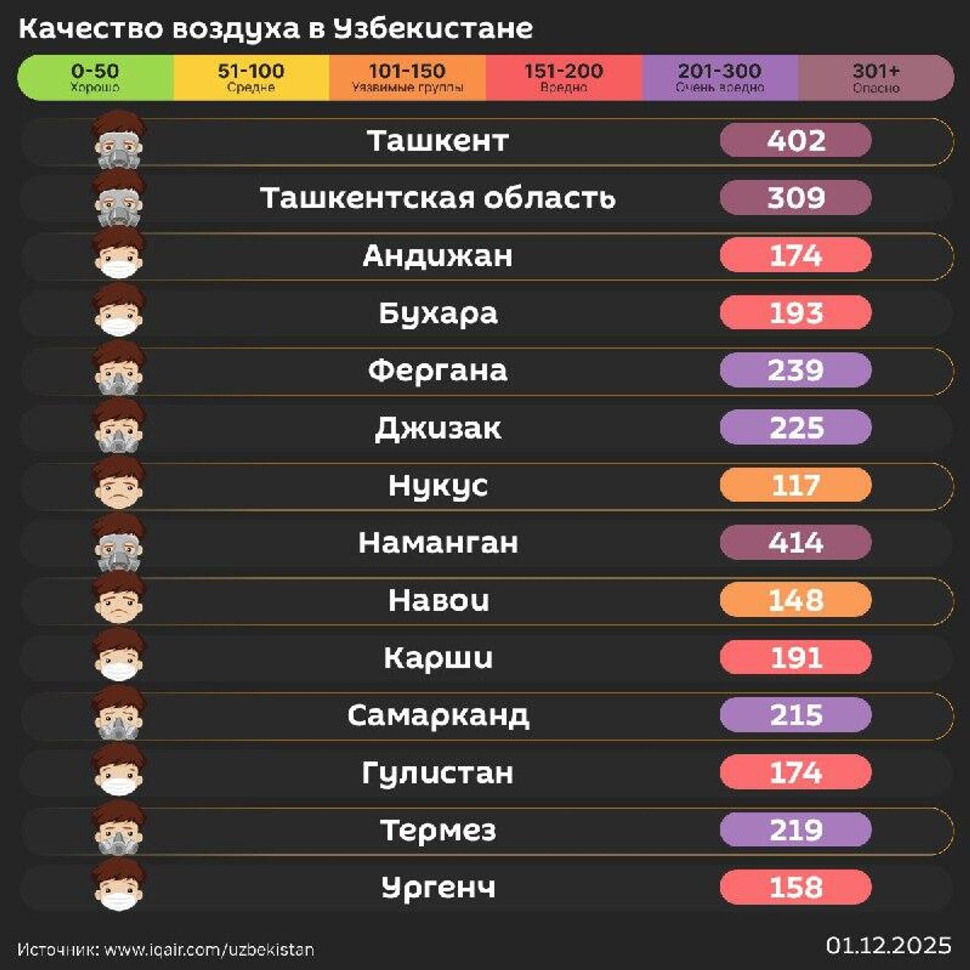 Воздух в Ташкенте сейчас очень вредный.Уровень его загрязнения превышает норму ВОЗ в 55 раз.При выходе на улицу рекомендуется надевать маску. @SputnikUzbekistan