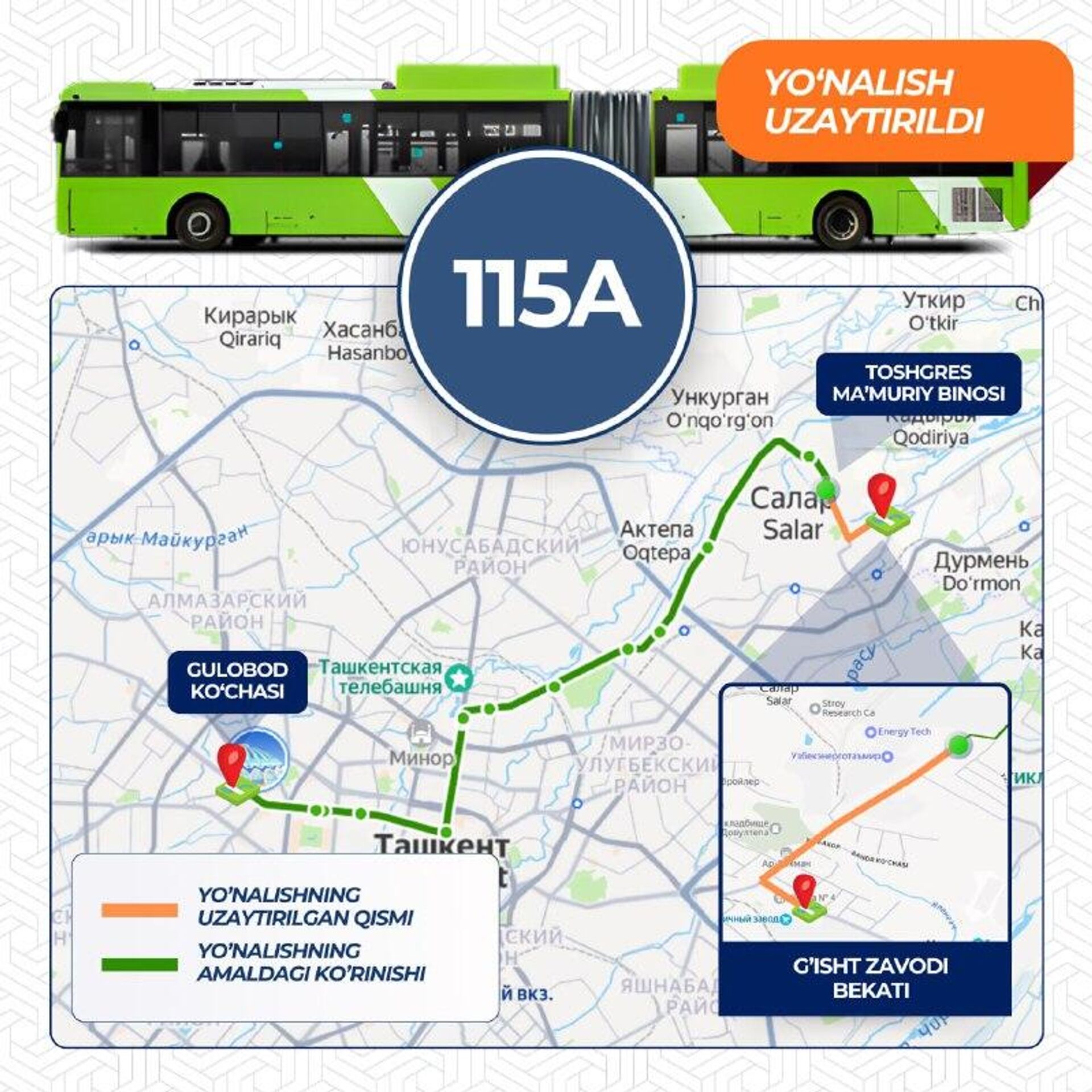 Ташкентскому автобусу № 115 продлили маршрут. С 4 декабря линия "Административное здание ТашГРЭС - Улица Гулобод" будет продлена от административного здания ТашГРЭС до остановки "Кирпичный завод", сообщили в Управлении транспорта столицы.@SputnikUzbekistan