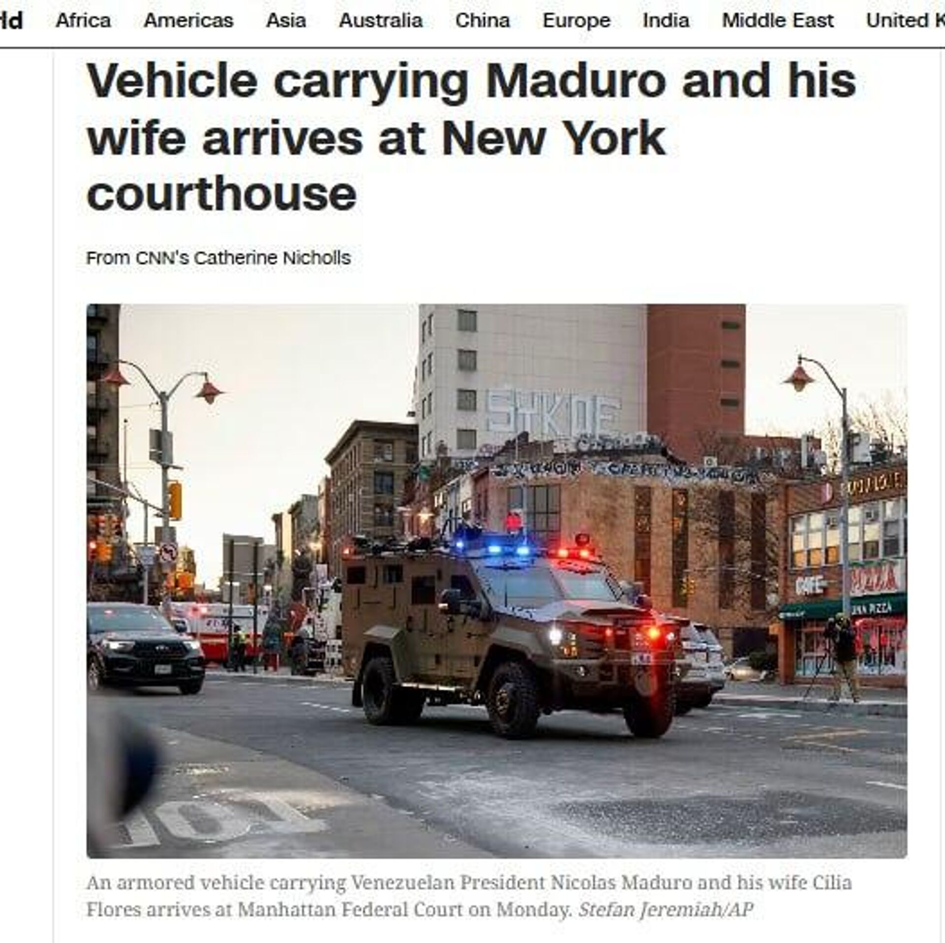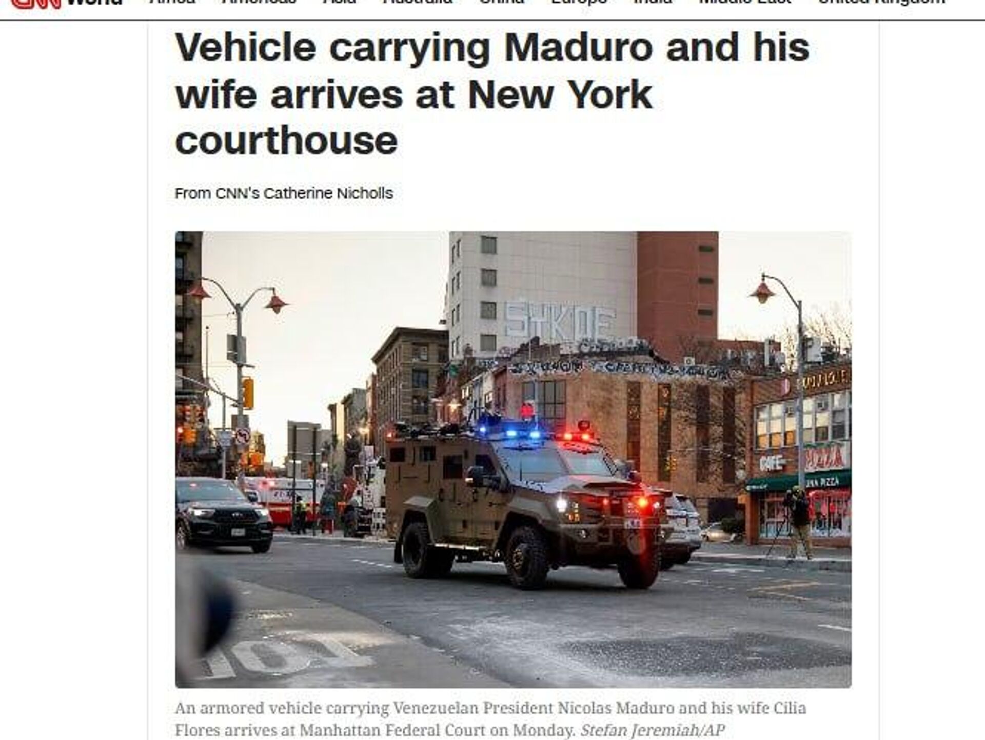 Бронированный автомобиль с Николасом Мадуро и его супругой подъезжает к зданию суда Нью-Йорка, где пройдет заседание, сообщает CNN.