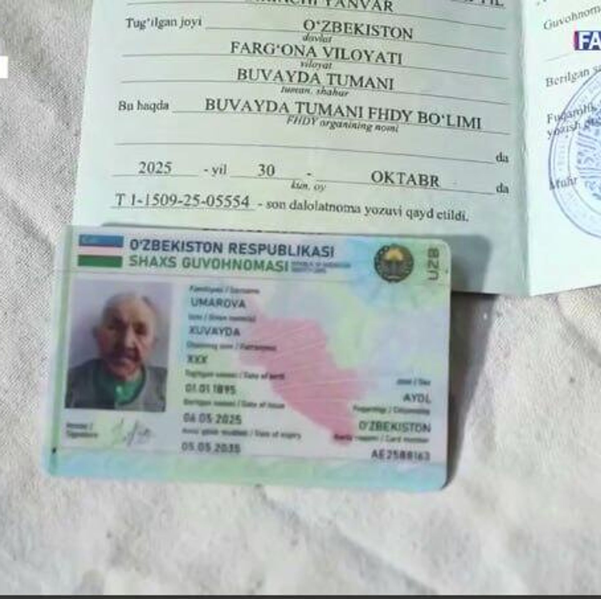 Хувайдо-момо Умарова родилась 1 января 1895 года и проживает в Бувайдинском районе Ферганской области.