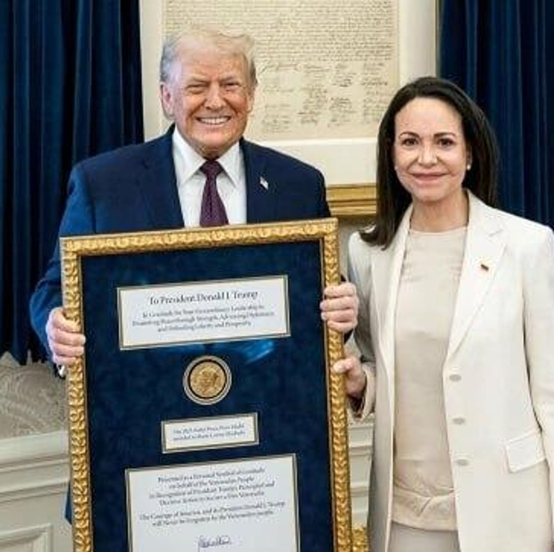 "Мария вручила мне свою Нобелевскую премию мира за работу, которую я проделал. Такой прекрасный жест взаимного уважения. Спасибо, Мария!" - написал Трамп в соцсетях.