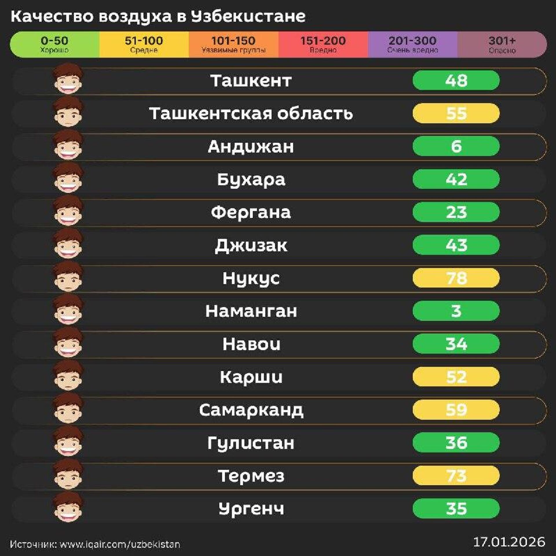 Качество воздуха в других городах республики - в инфографике @SputnikUzbekistan.