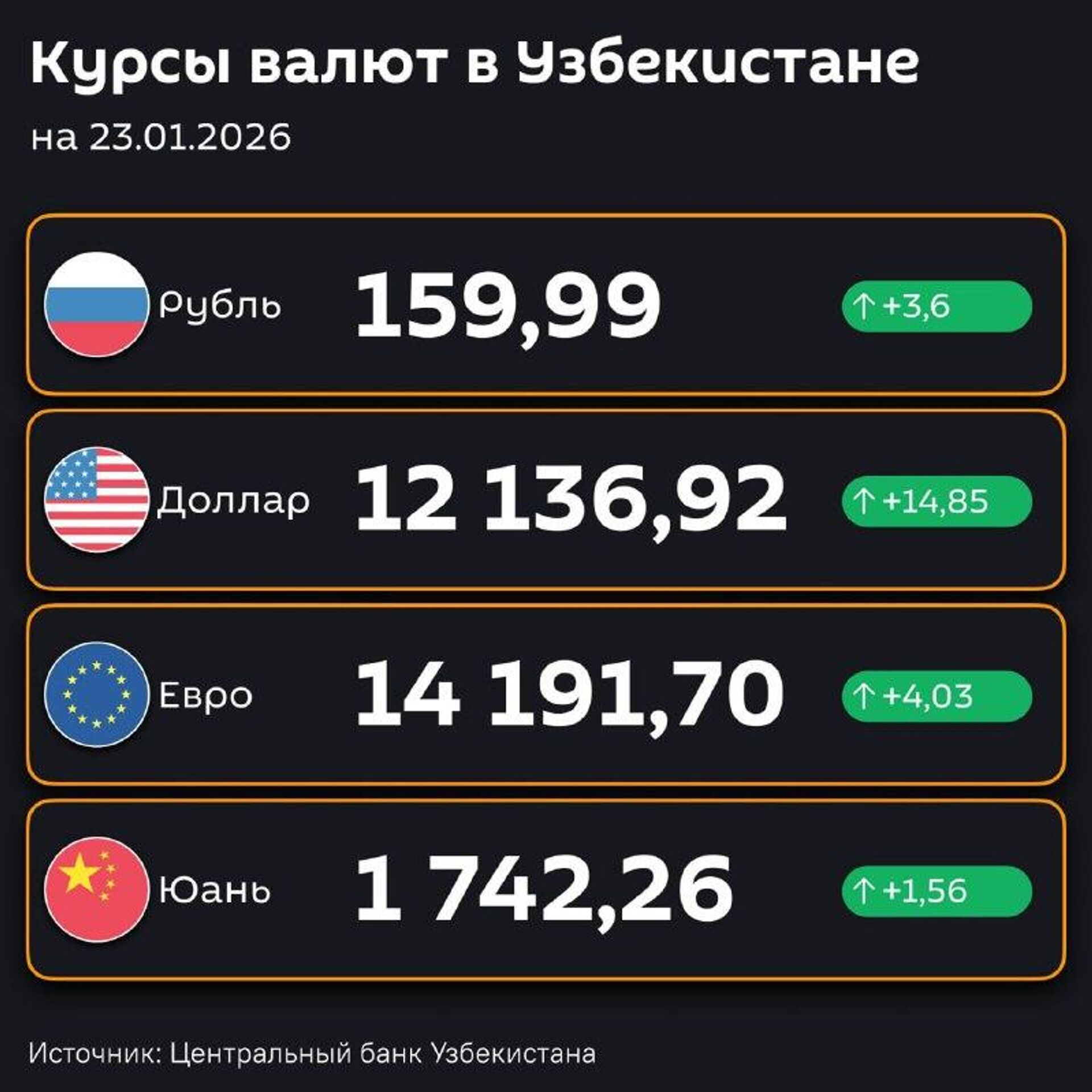 Подорожали — ЦБ РУз установил новые курсы валют по отношению к суму с 23 января@SputnikUzbekistan 22.01.2026, Sputnik Узбекистан