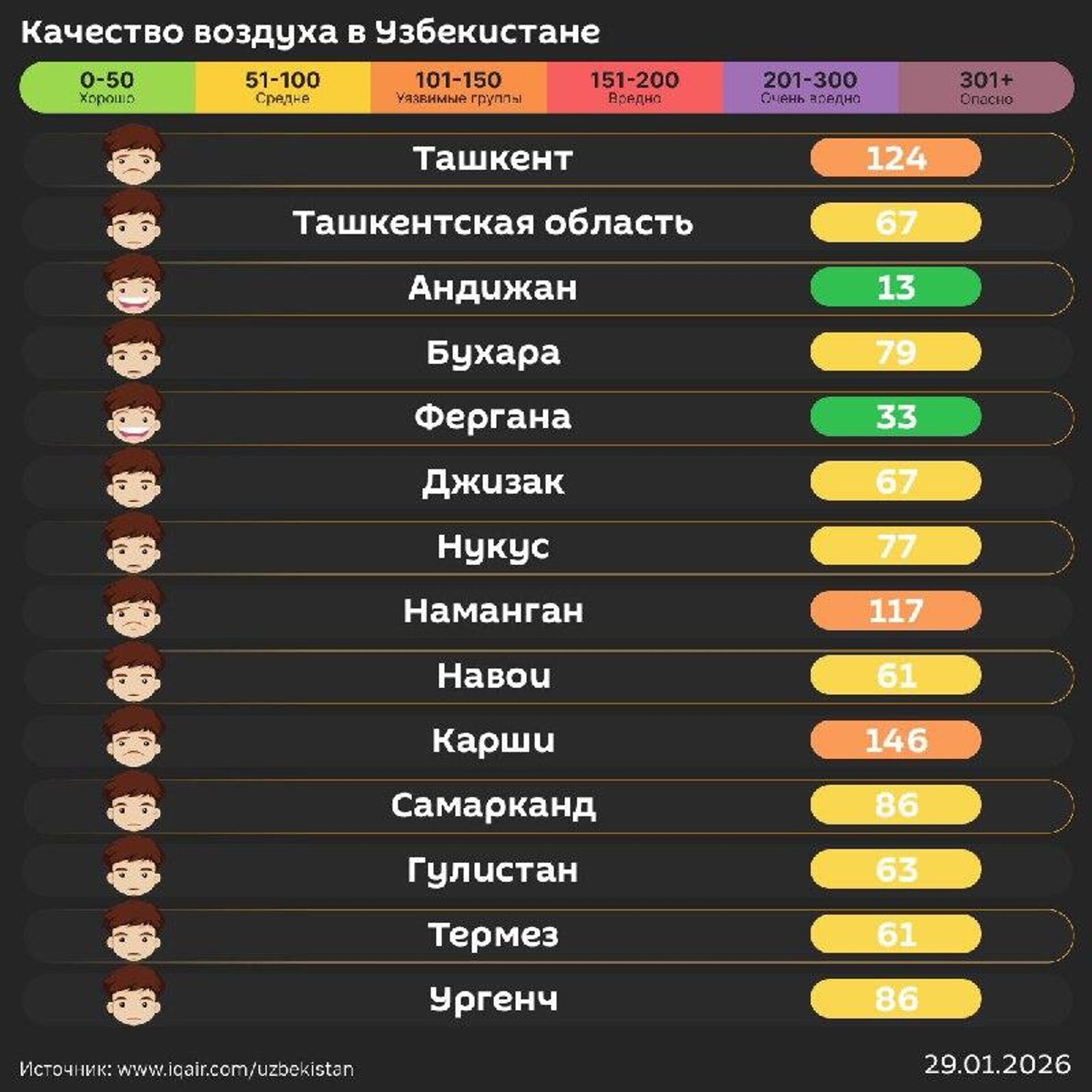 Качество воздуха в других городах республики - в инфографике @SputnikUzbekistan.