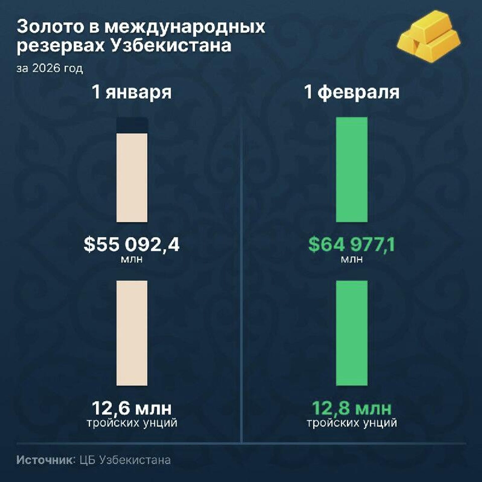 Золотовалютные резервы Узбекистана на 1 февраля 2026 года достигли $75,08 млрд – это максимальный показатель за весь период статистики с 2013 года.