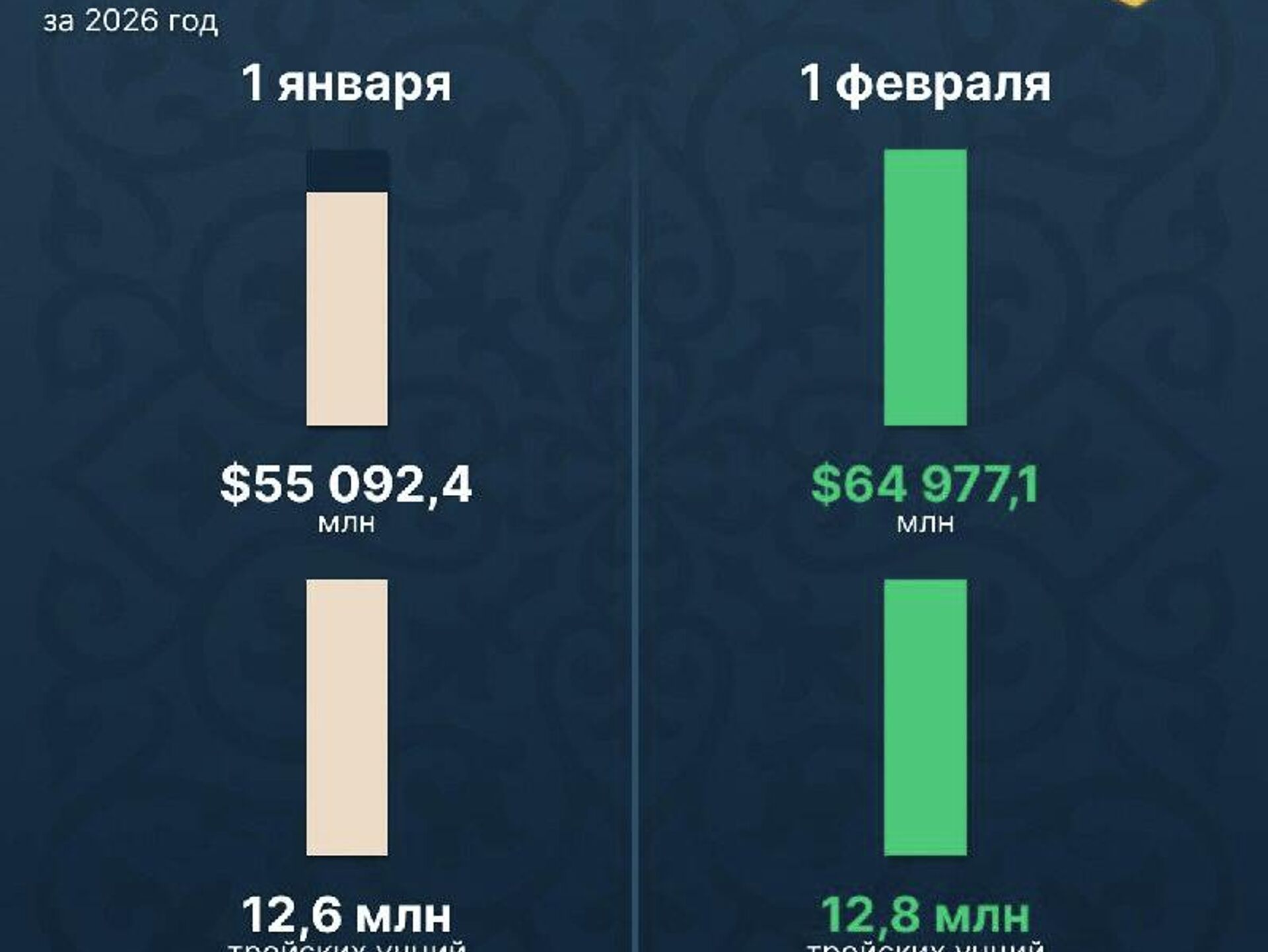 По данным Центробанка, за последний месяц резервы страны прибавили $8,76 млрд, а с 2025 года увеличились более чем на 82%.