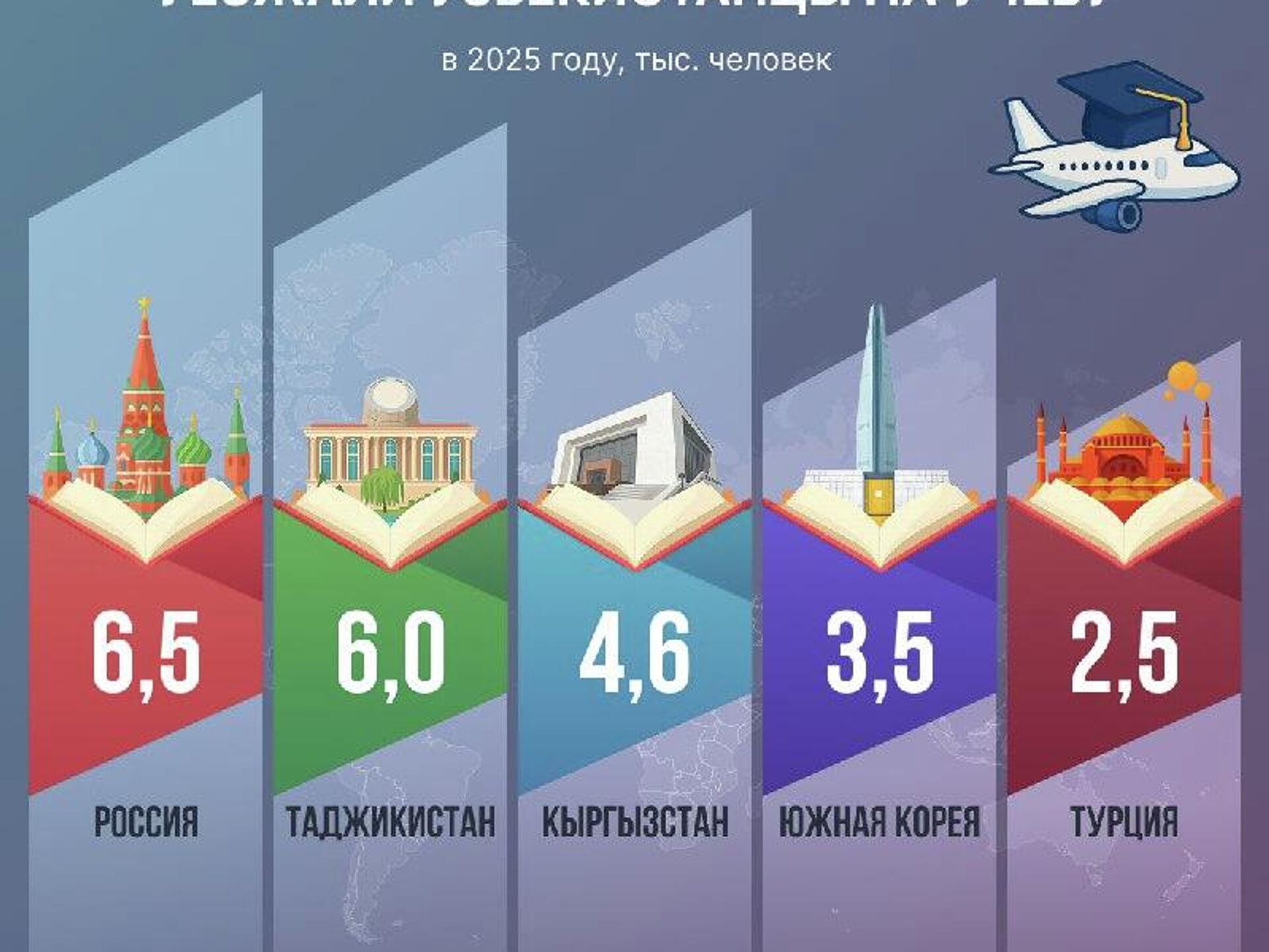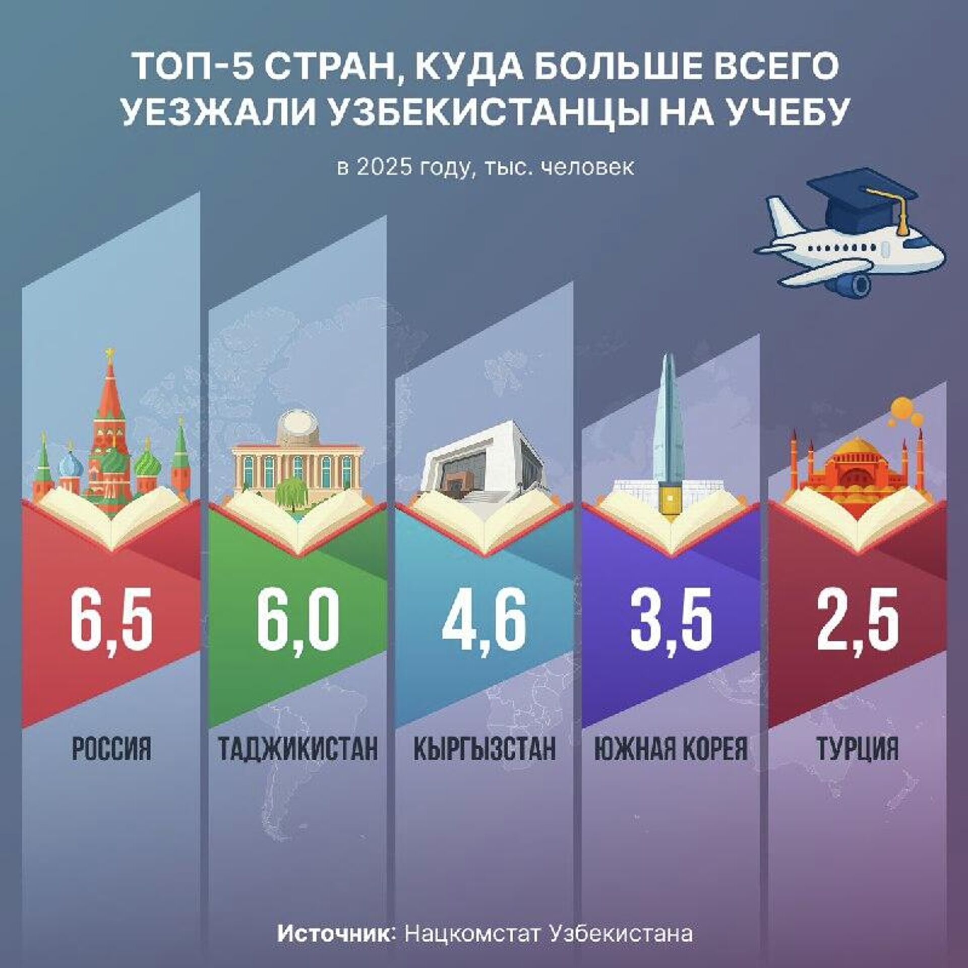 В топ-5 стран, куда узбекистанцы отправляются с целью обучения, также вошли Таджикистан, Кыргызстан, Южная Корея и Турция.