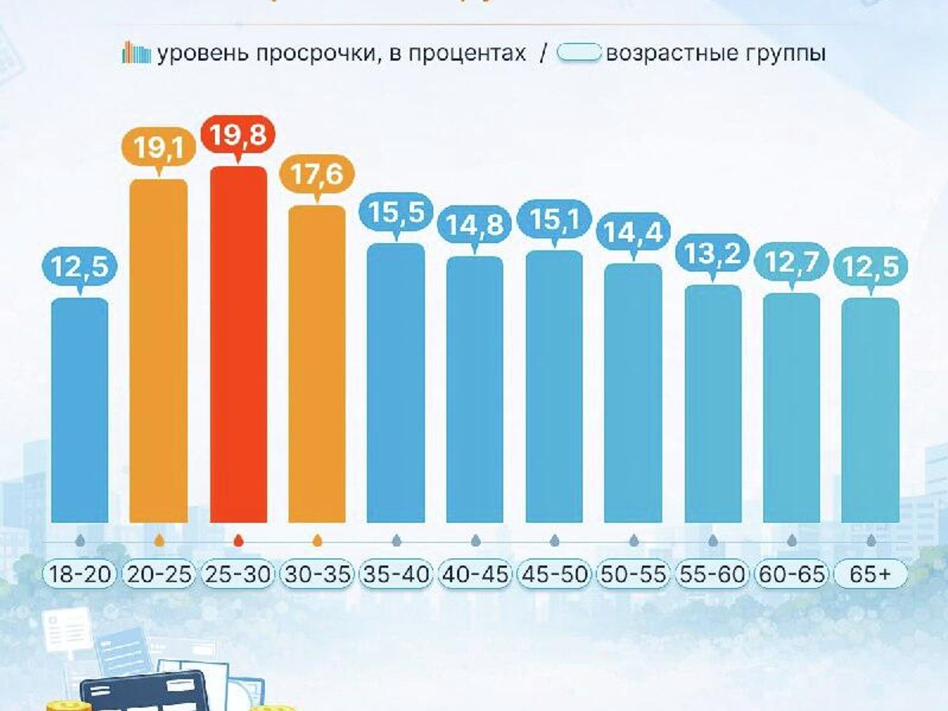 Согласно анализу, чаще всего просрочки по кредитам допускают заемщики в возрасте 20–35 лет. Эта тенденция у молодых заемщиков объясняется нестабильностью дохода, недостаточным опытом пользования кредитами и склонностью к риску.