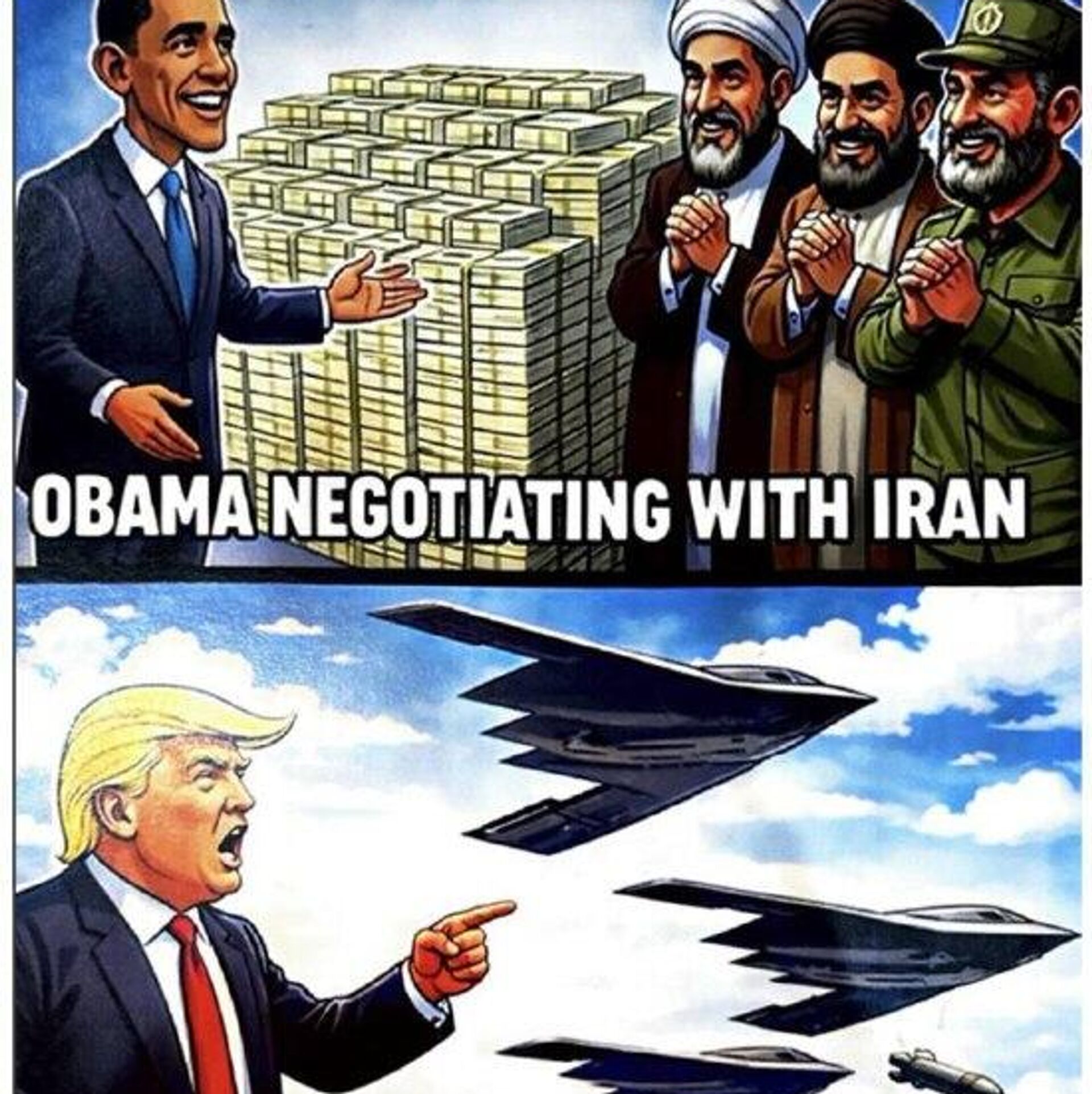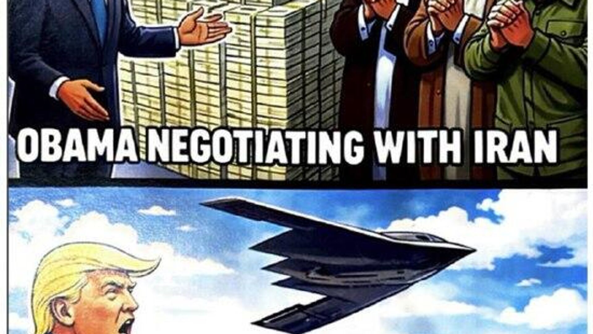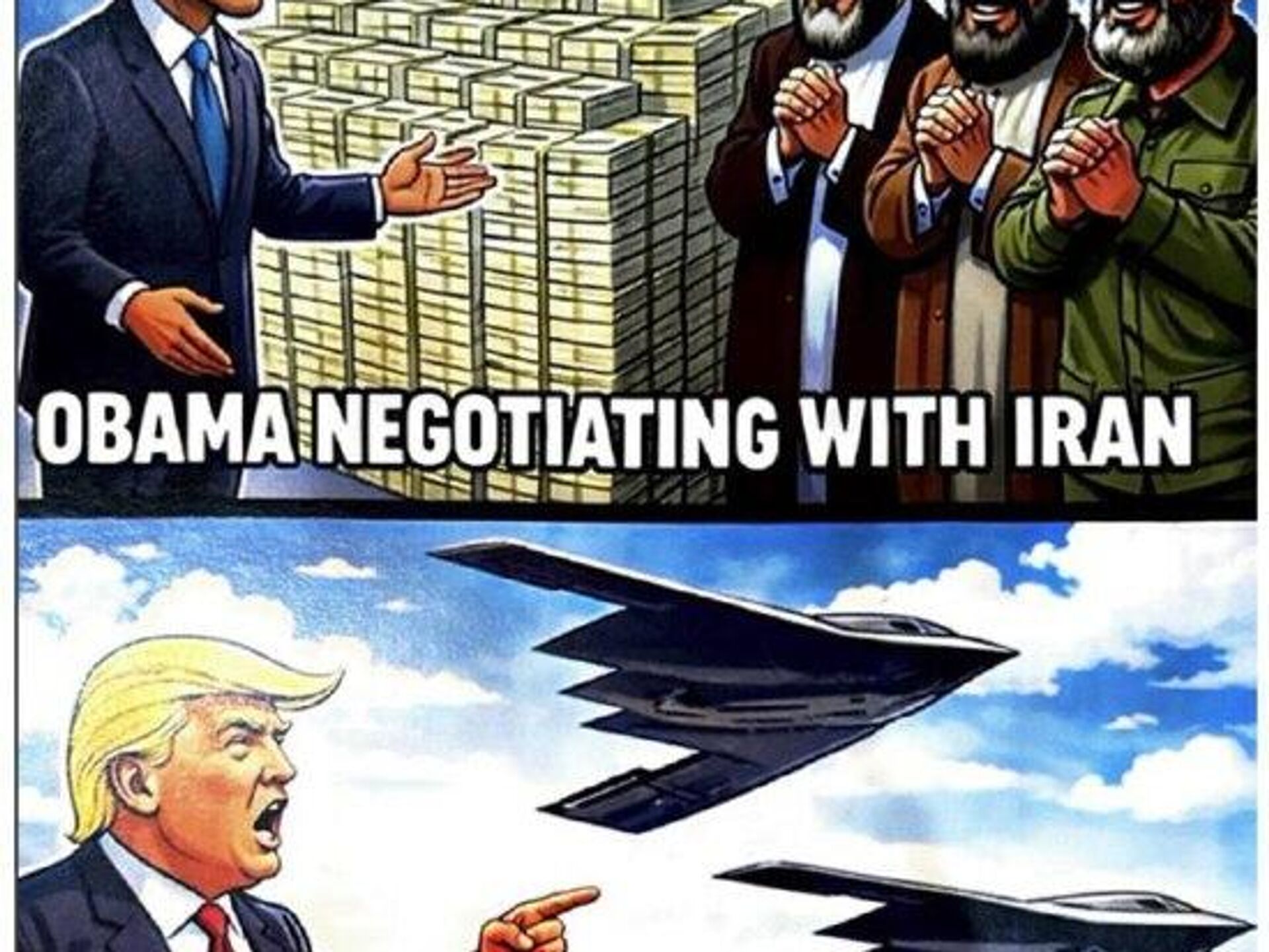 Тем временем Дональд Трамп опубликовал изображение, в котором сравнил свою политику в отношении Ирана с подходом Барак Обама. На картинке Обама показан передающим Тегерану пачки денег, тогда как Трамп изображег на фоне истребителей.