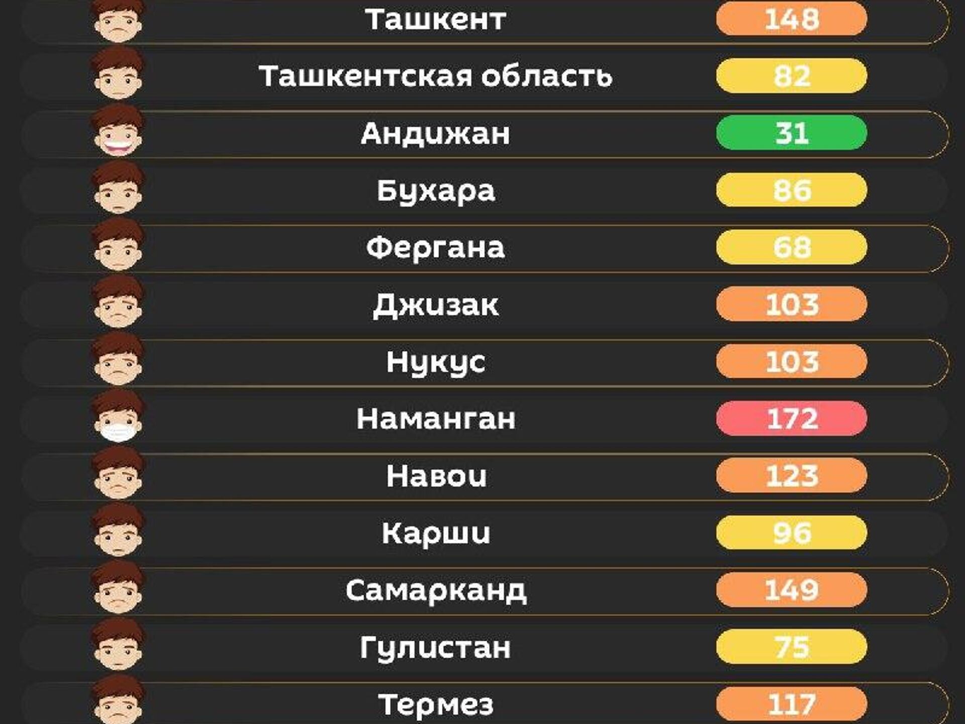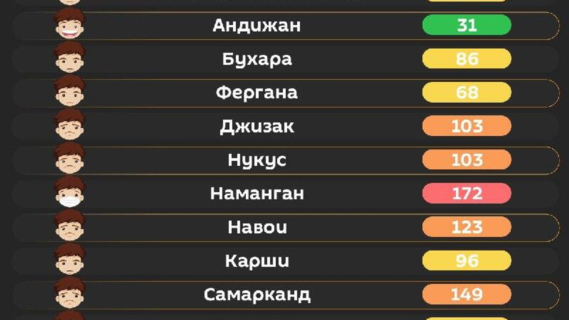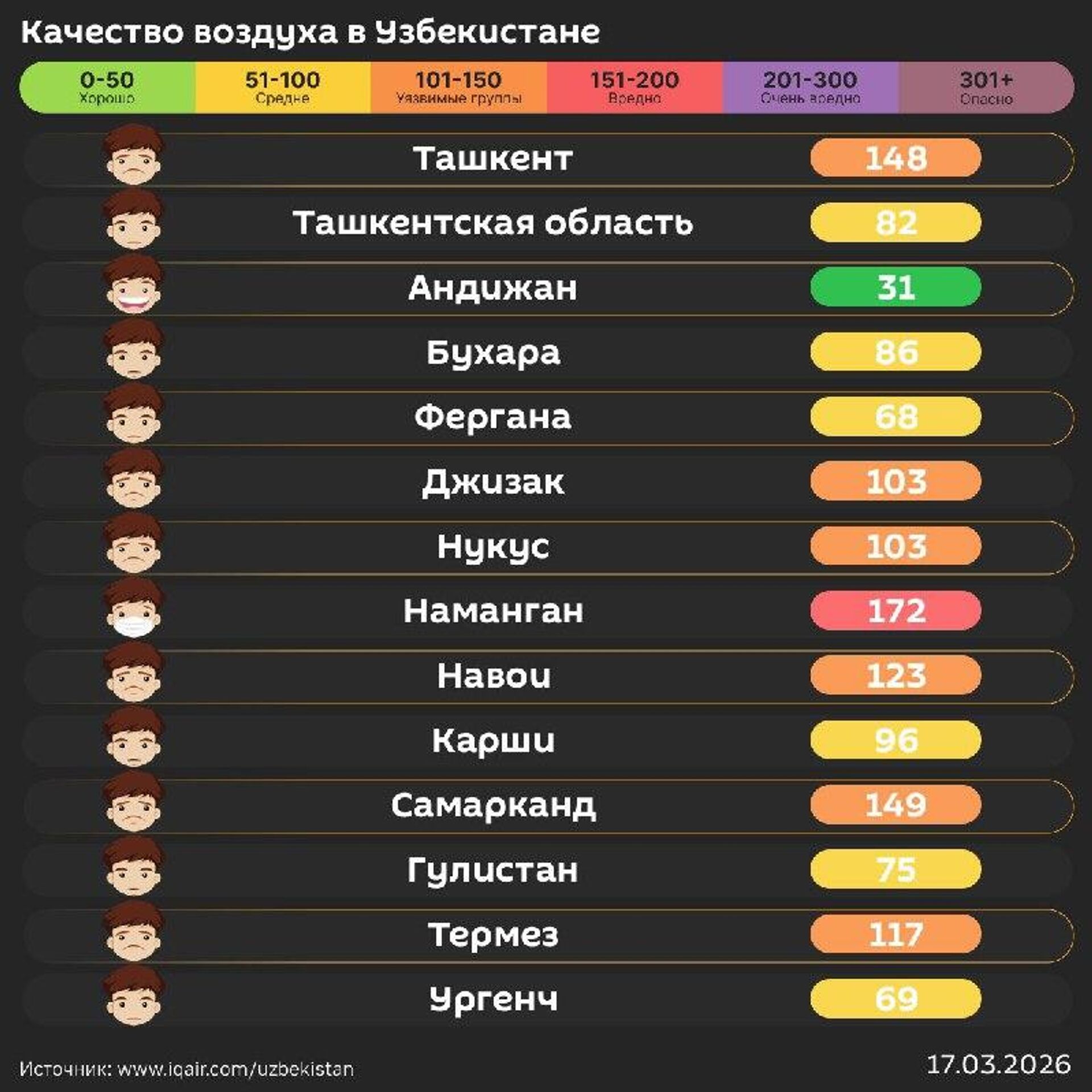Качество воздуха в других городах республики – в инфографике @SputnikUzbekistan.