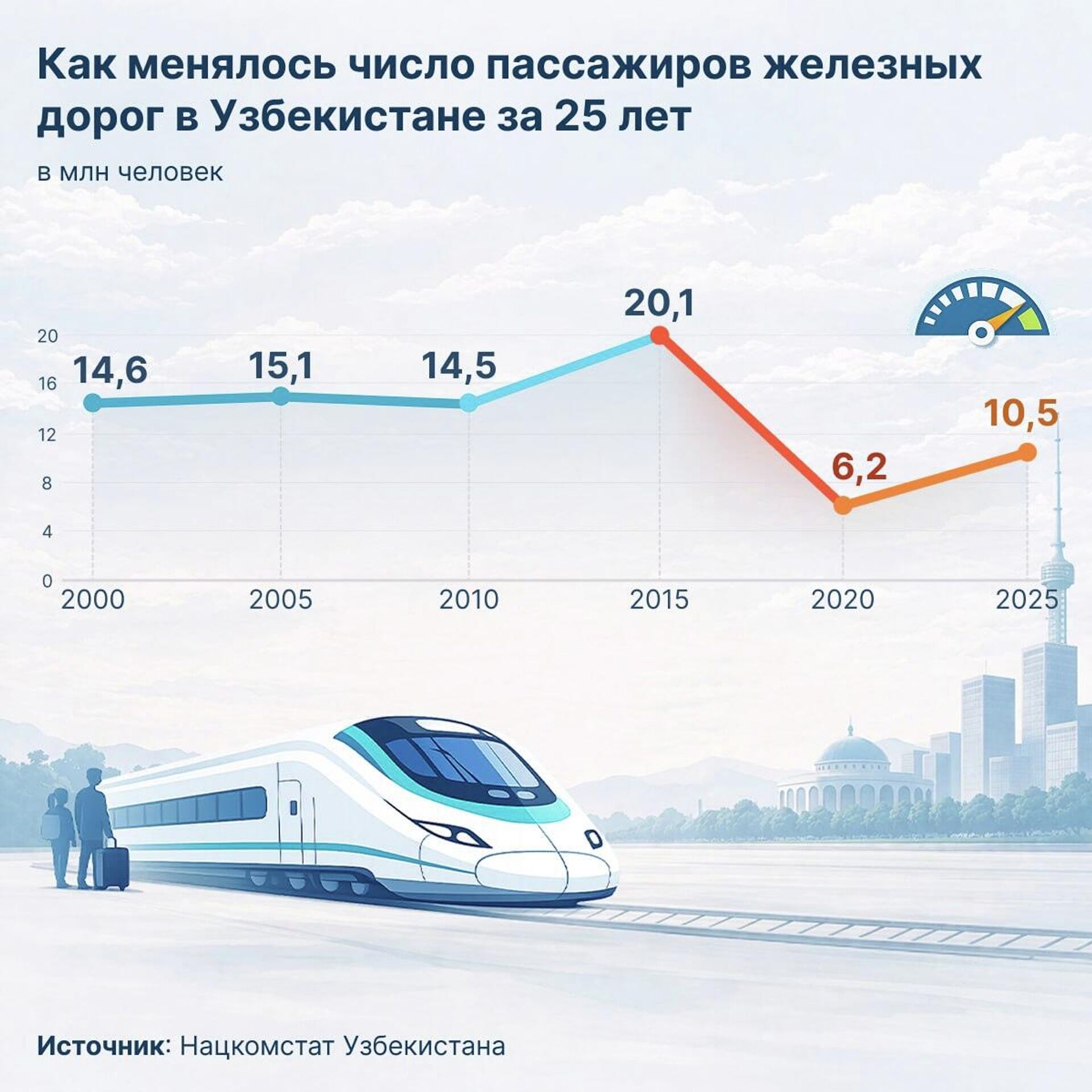 Пассажиропоток на железных дорогах Узбекистана за 25 лет менялся неравномерно.