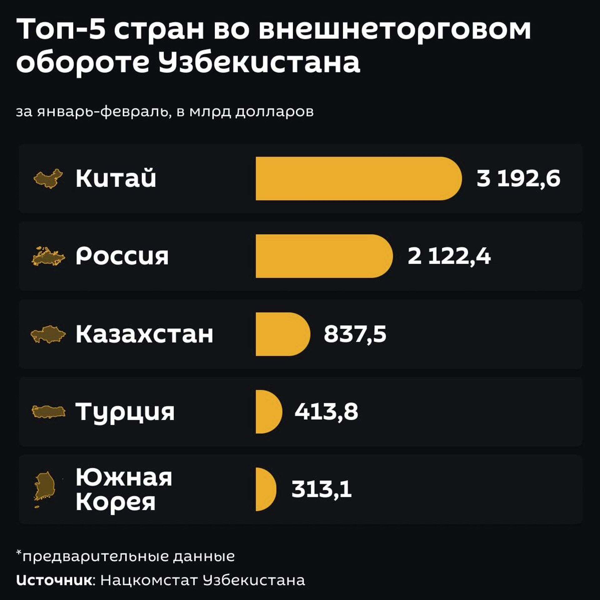 Во внешнеторговом обороте Узбекистана в 2026 году наиболее заметную роль играют Китай и Россия.