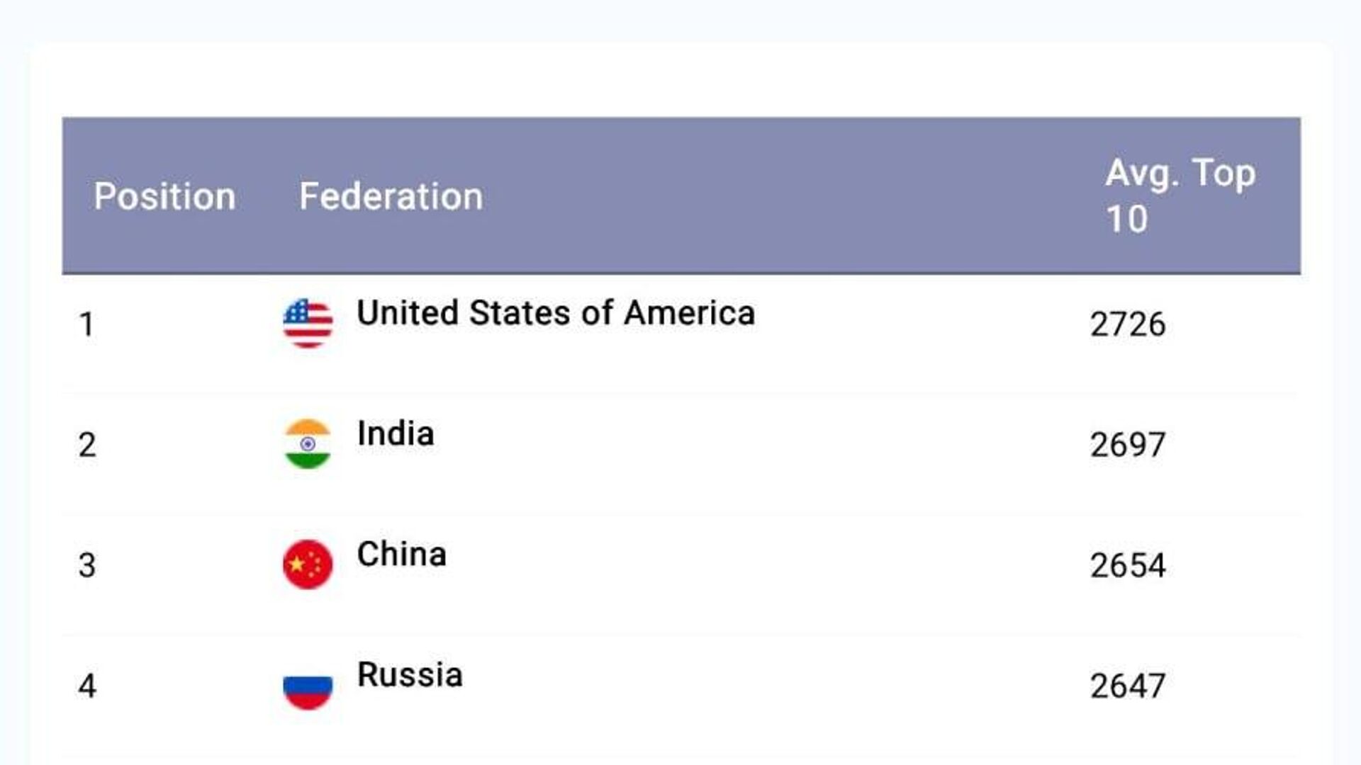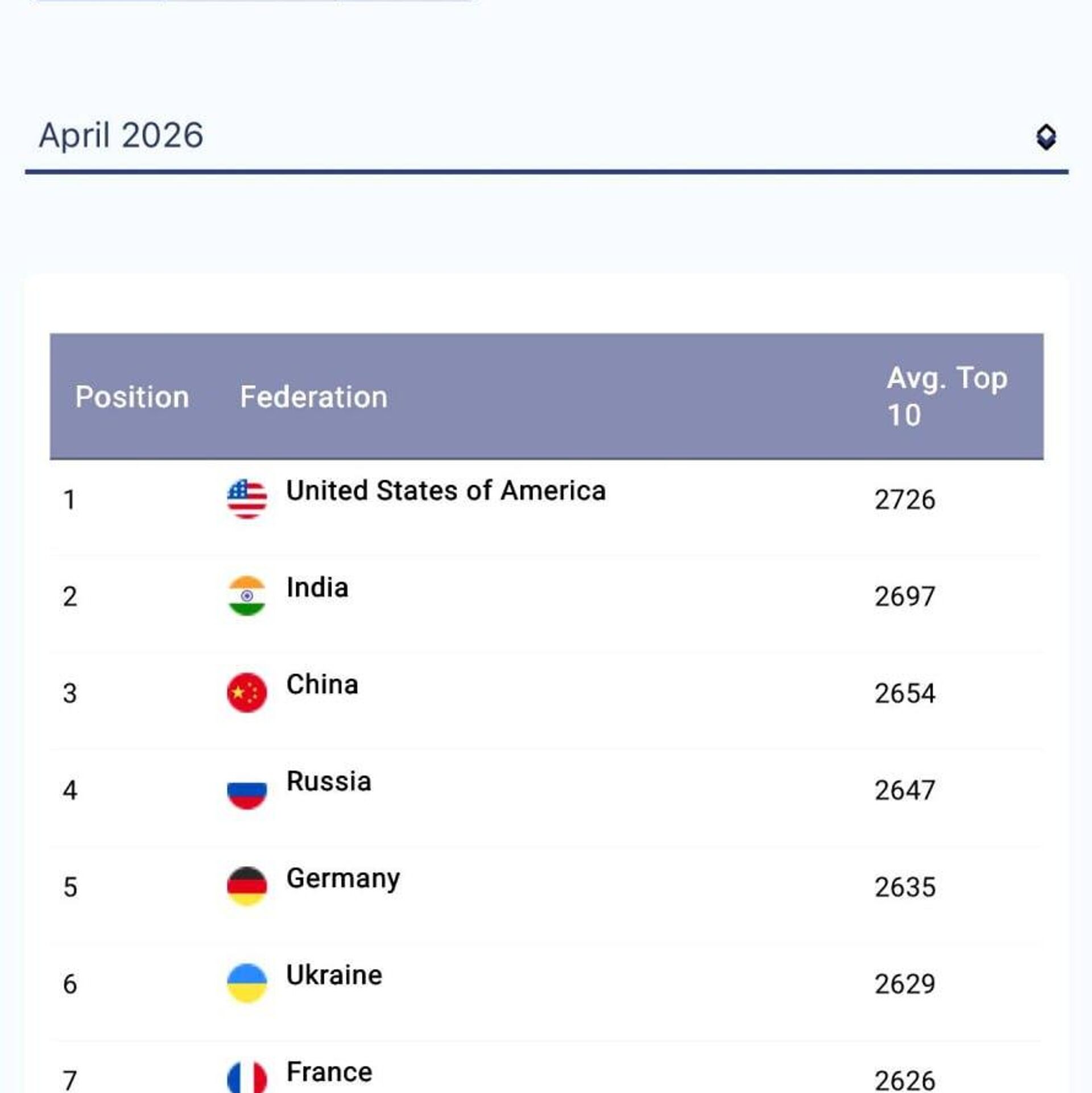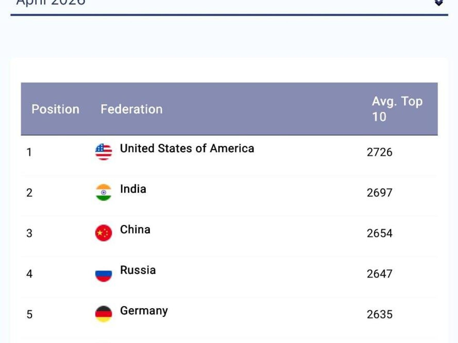 В январе 2026 года сборная была на 12-м месте. Список возглавляют США, Индия и Китай.