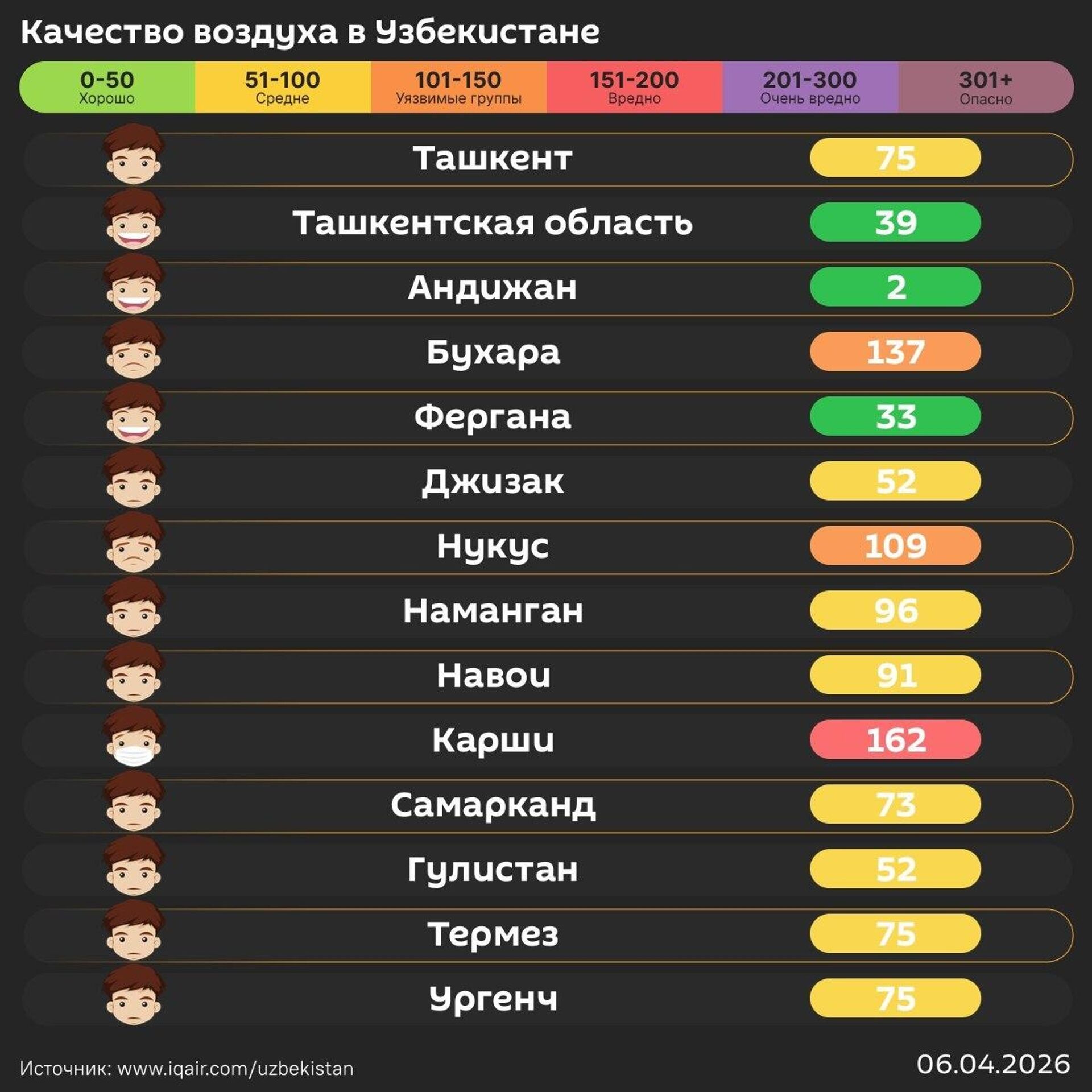 Качество воздуха в других регионах республики - в инфографике @SputnikUzbekistan.