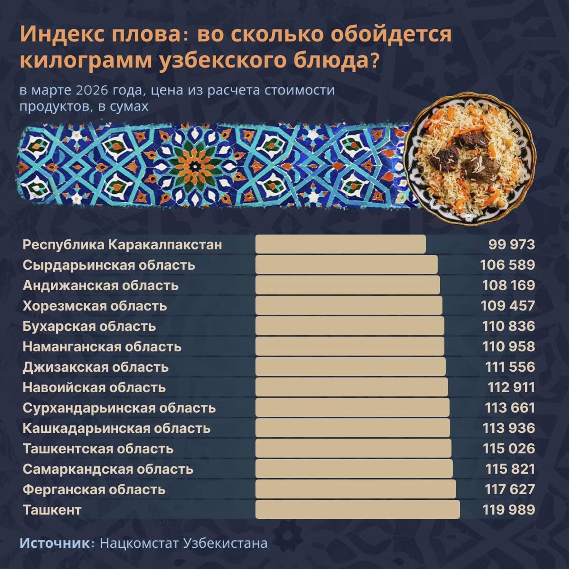 Наиболее бюджетный вариант предлагают в Каракалпакстане – плов здесь обойдется в 99,9 тыс. сумов.