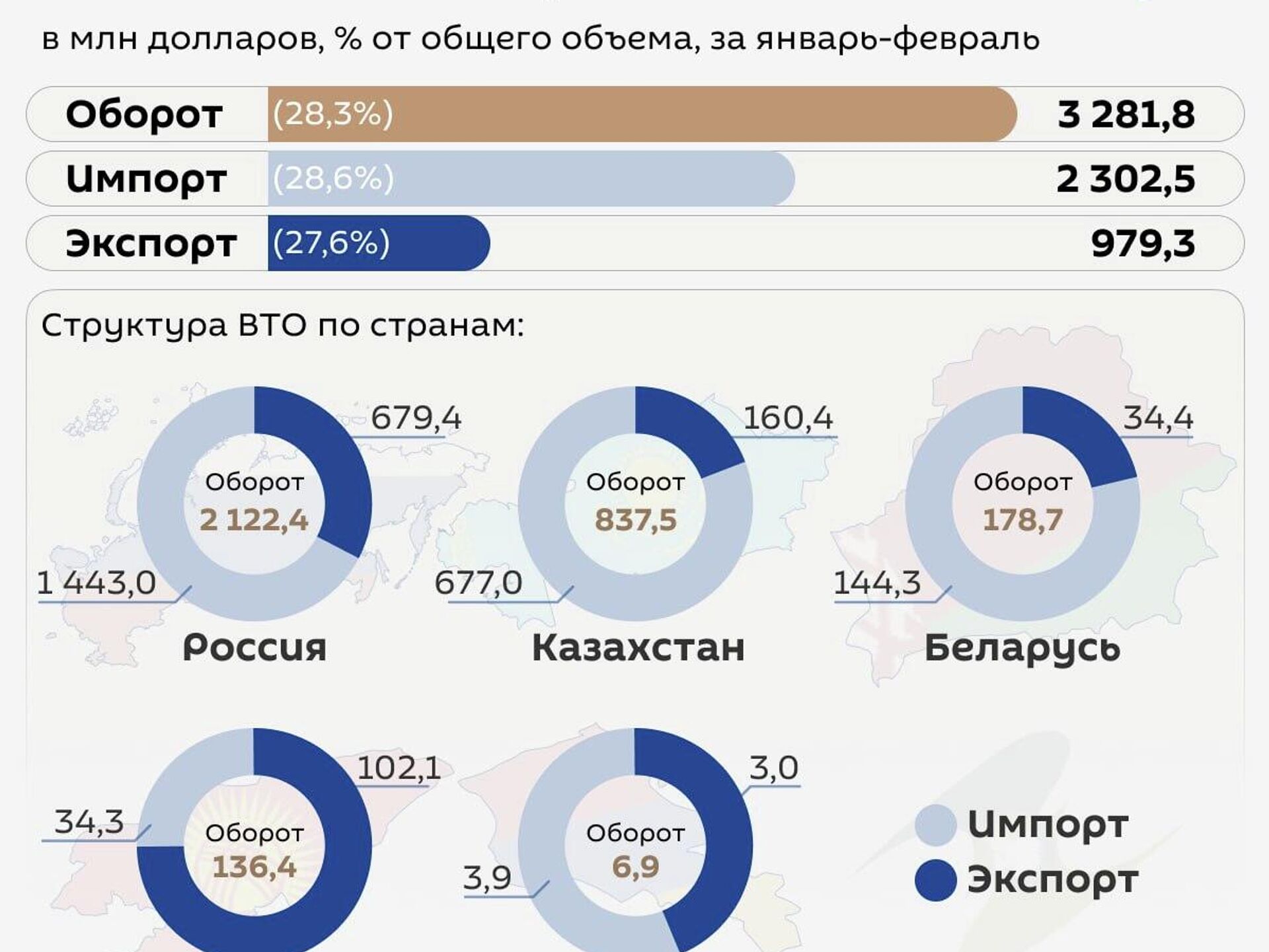 Внешнеторговый оборот Узбекистана со странами ЕАЭС за январь-февраль 2026 года составил $3,3 млрд - это 28,3% от общего объема.Из них экспорт - $2,3 млрд... 08.04.2026, Sputnik Узбекистан