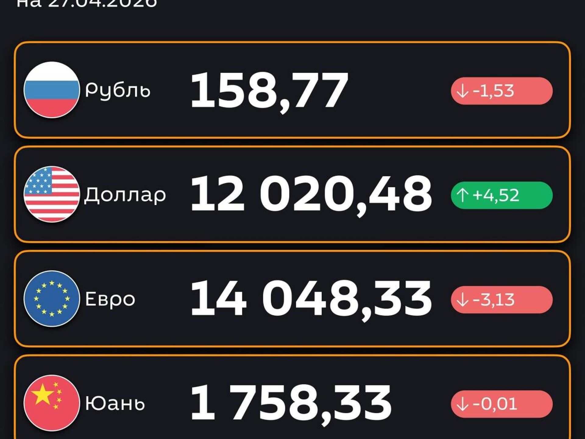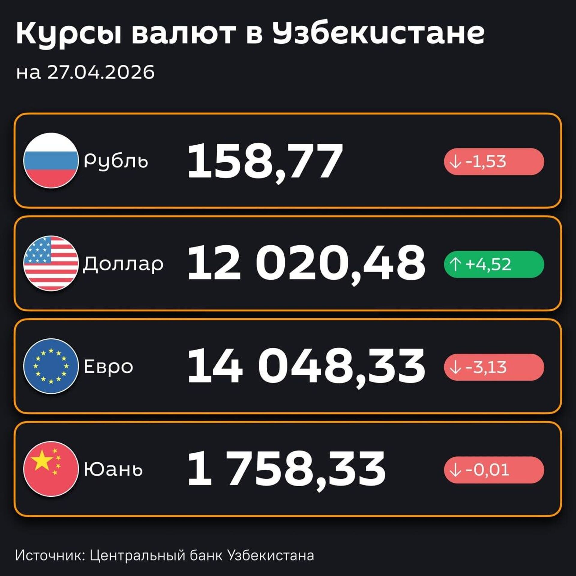 16:03 24.04.2026 (обновлено: 16:17 24.04.2026) Доллар подорожал, рубль подешевел — ЦБ РУз установил новые курсы валют по отношению к суму с 27 апреля