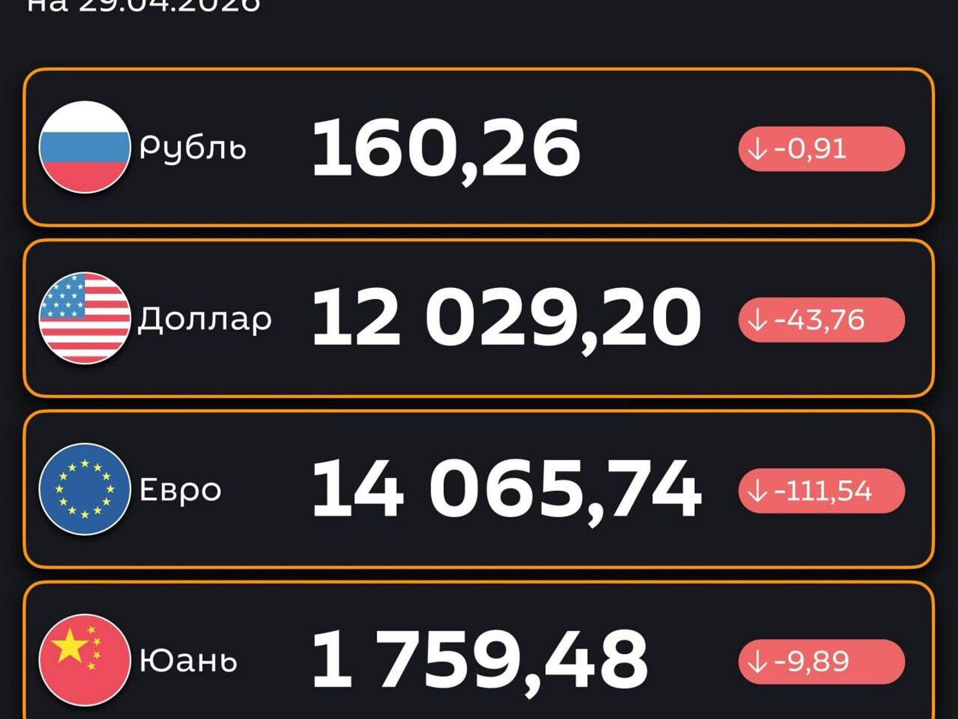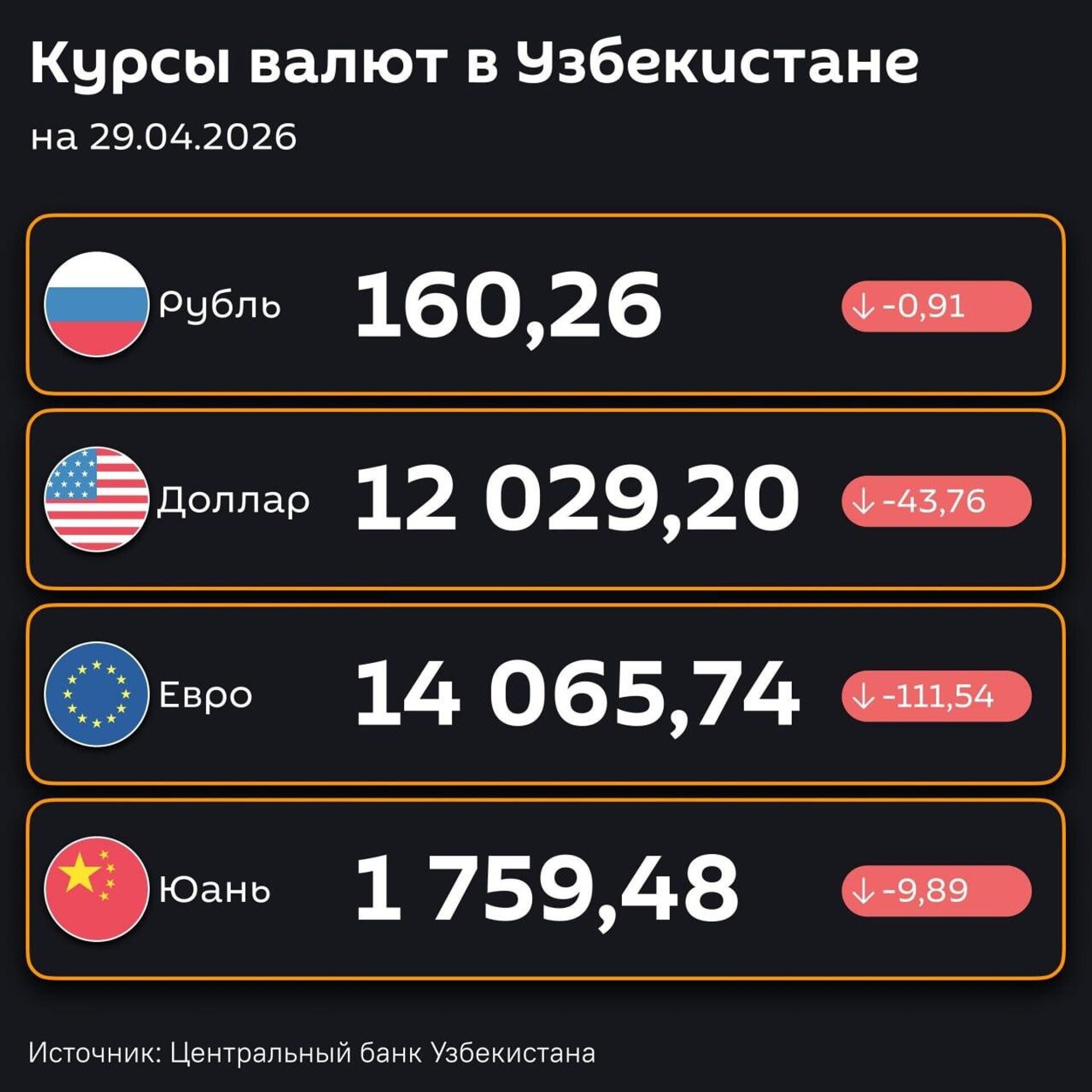 16:04 28.04.2026 (обновлено: 16:17 28.04.2026) Доллар и рубль подешевели — ЦБ РУз установил новые курсы валют по отношению к суму с 29 апреля