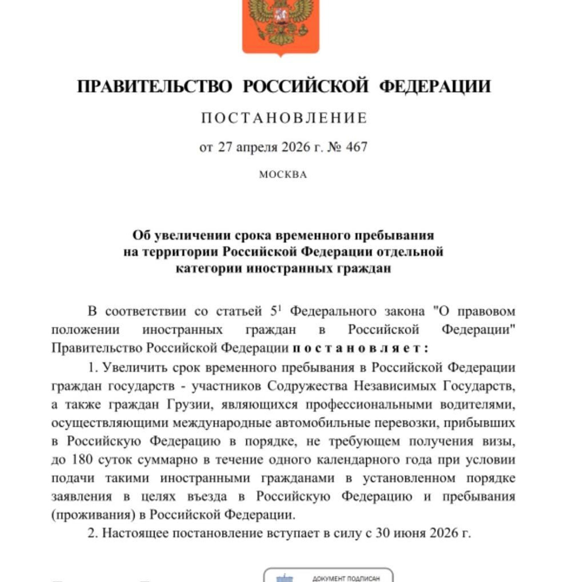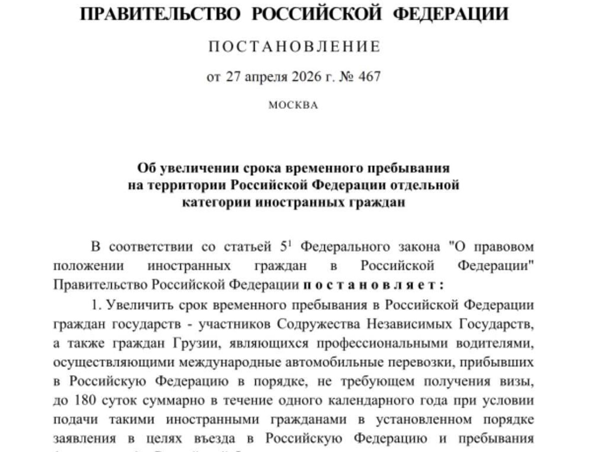 10:37 29.04.2026 (обновлено: 10:47 29.04.2026) Водители из СНГ и Грузии смогут находиться в России до 180 дней вместо нынешних 90, следует из постановления правительства.